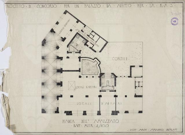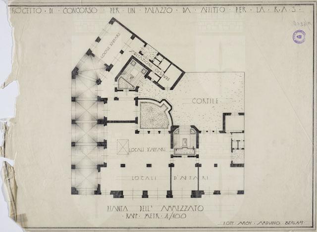 Il disegno in esame appartiene alla serie "Progetto di concorso per un palazzo di affitto per la Riunione Adriatica di Sicurtà, da costruirsi a Trieste in Piazza Oberdan", cfr. schede CMSAOAR10_4207-CMSAOAR10_4218, eseguito da Arduino Berlam. Il 3 febbraio 1934 Arnoldo Frigessi di Rattalma, presidente della Riunione Adriatica di Sicurtà, acquistò l’ultimo lotto disponibile nell’area di piazza Oberdan (pari a 1165 mq) per edificare un palazzo ad uso uffici e abitazioni di alto livello, con l’obbligo di rispettare i vincoli indicati nel piano di sistemazione dell’esedra Oberdan del 1925, per quanto riguardava le facciate e i portici. Lo stesso anno venne indetto un concorso ristretto, cui parteciparono Arduino Berlam, Gustavo Pulitzer-Finali e Umberto Nordio, che risultò vincitore (cfr. Krasovec in Nicoloso, Rovello 2005, pp. 177-179, n. 19).