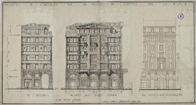 Il disegno in esame appartiene alla serie "Progetto di concorso per un palazzo di affitto per la Riunione Adriatica di Sicurtà, da costruirsi a Trieste in Piazza Oberdan", cfr. schede CMSAOAR10_4207-CMSAOAR10_4218, eseguito da Arduino Berlam. Il 3 febbraio 1934 Arnoldo Frigessi di Rattalma, presidente della Riunione Adriatica di Sicurtà, acquistò l’ultimo lotto disponibile nell’area di piazza Oberdan (pari a 1165 mq) per edificare un palazzo ad uso uffici e abitazioni di alto livello, con l’obbligo di rispettare i vincoli indicati nel piano di sistemazione dell’esedra Oberdan del 1925, per quanto riguardava le facciate e i portici. Lo stesso anno venne indetto un concorso ristretto, cui parteciparono Arduino Berlam, Gustavo Pulitzer-Finali e Umberto Nordio, che risultò vincitore (cfr. Krasovec in Nicoloso, Rovello 2005, pp. 177-179, n. 19).