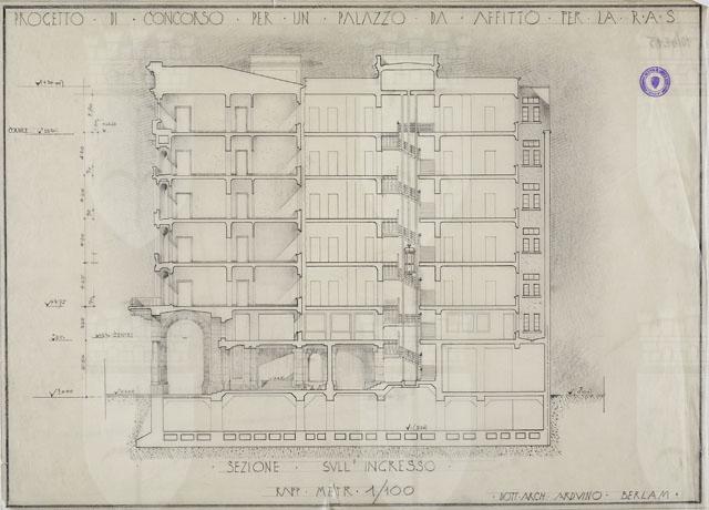 Il disegno in esame appartiene alla serie "Progetto di concorso per un palazzo di affitto per la Riunione Adriatica di Sicurtà, da costruirsi a Trieste in Piazza Oberdan", cfr. schede CMSAOAR10_4207-CMSAOAR10_4218, eseguito da Arduino Berlam. Il 3 febbraio 1934 Arnoldo Frigessi di Rattalma, presidente della Riunione Adriatica di Sicurtà, acquistò l’ultimo lotto disponibile nell’area di piazza Oberdan (pari a 1165 mq) per edificare un palazzo ad uso uffici e abitazioni di alto livello, con l’obbligo di rispettare i vincoli indicati nel piano di sistemazione dell’esedra Oberdan del 1925, per quanto riguardava le facciate e i portici. Lo stesso anno venne indetto un concorso ristretto, cui parteciparono Arduino Berlam, Gustavo Pulitzer-Finali e Umberto Nordio, che risultò vincitore (cfr. Krasovec in Nicoloso, Rovello 2005, pp. 177-179, n. 19).
