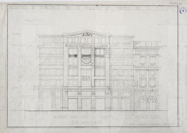 Il disegno in esame appartiene alla serie "Progetto di concorso per un palazzo di affitto per la Riunione Adriatica di Sicurtà, da costruirsi a Trieste in Piazza Oberdan", cfr. schede CMSAOAR10_4207-CMSAOAR10_4218, eseguito da Arduino Berlam. Il 3 febbraio 1934 Arnoldo Frigessi di Rattalma, presidente della Riunione Adriatica di Sicurtà, acquistò l’ultimo lotto disponibile nell’area di piazza Oberdan (pari a 1165 mq) per edificare un palazzo ad uso uffici e abitazioni di alto livello, con l’obbligo di rispettare i vincoli indicati nel piano di sistemazione dell’esedra Oberdan del 1925, per quanto riguardava le facciate e i portici. Lo stesso anno venne indetto un concorso ristretto, cui parteciparono Arduino Berlam, Gustavo Pulitzer-Finali e Umberto Nordio, che risultò vincitore (cfr. Krasovec in Nicoloso, Rovello 2005, pp. 177-179, n. 19).