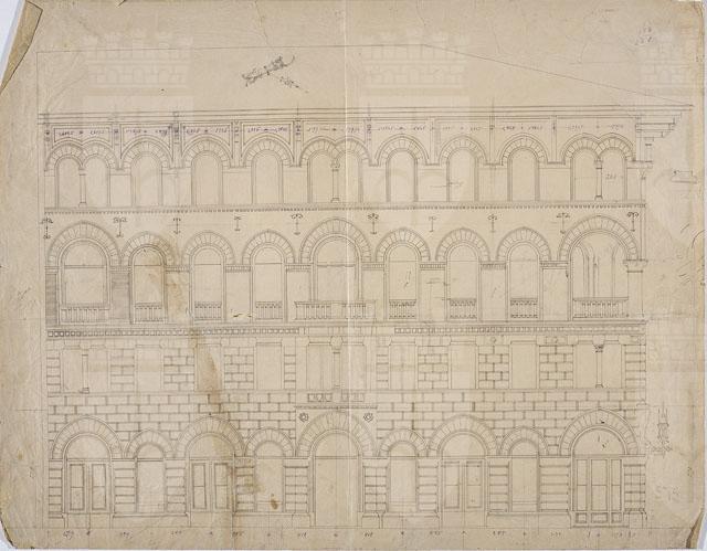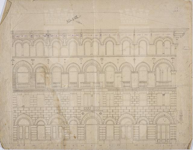 Il disegno è da riferirsi alla progettazione di Casa Leitenburg (cfr. CMSAOAR10_4227-CMSAOAR10_4232). Progettato nel 1887 da Ruggero Berlam per Edoardo de Leitenburg, l’edificio è considerato un capolavoro dell’architetto triestino, formatosi a Brera con Camillo Boito, oltre che un manifesto politico. Si tratta di un edificio di gusto neotuscanico, che divenne modello per innumerevoli edifici abitativi triestini, costruiti fino al 1940, quale esempio di autentica "architettura italiana". L’adozione, infatti, dello stile neo-fiorentino fu “apprezzata da alcuni eminenti triestini che ne valutarono la componente ideologica intesa quale rifiuto dello "stile austriaco" a favore di un’elaborazione autenticamente italiana” (Lorber 2007, p. 80). Si tratta di un'architettura equilibrata nel disegno in cui si accoppiano o isolano finestre architravate nel primo piano e a pieno centro nel secondo e terzo, ove sono rimarcate, di contro allo sfondo del cotto, da estradossi bicromi tendenti all'archiacuto. Nel disegno in esame, l’elaborazione del progetto non è ancora quella finale (cfr. CMSAOAR10_4227): lo spigolo del piano terra, come quelli del primo e terzo, sono pieni e si contrappongono all’apertura del quarto piano.