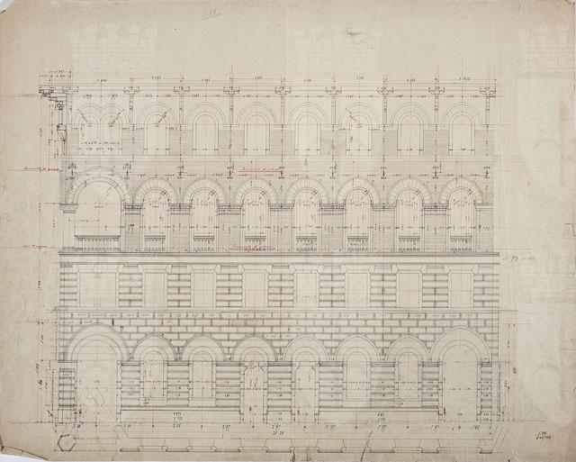 Il disegno è da riferirsi alla progettazione di Casa Leitenburg, cfr. CMSAOAR10_4226-CMSAOAR10_4232. Progettato nel 1887 da Ruggero Berlam per Edoardo de Leitenburg, l’edificio è considerato un capolavoro dell’architetto triestino, formatosi a Brera con Camillo Boito, oltre che un manifesto politico. Si tratta di un edificio di gusto neotuscanico, che divenne modello per innumerevoli edifici abitativi triestini, costruiti fino al 1940, quale esempio di autentica "architettura italiana". L’adozione, infatti, del neo-fiorentino fu “apprezzata da alcuni eminenti triestini che ne valutarono la componente ideologica intesa quale rifiuto dello "stile austriaco" a favore di un’elaborazione autenticamente italiana” (Lorber 2007, p. 80). Si tratta di un edificio equilibrato nel disegno in cui si accoppiano o isolano finestre architravate nel primo piano e a pieno centro nel secondo e terzo, ove sono rimarcate, di contro allo sfondo del cotto, da estradossi quasi archiacuti bicromi. Il disegno in esame illustra la facciata prospiciente la via Rossetti, in cui, eccetto per la soluzione d'angolo, le finestre non compaiono appaiate.