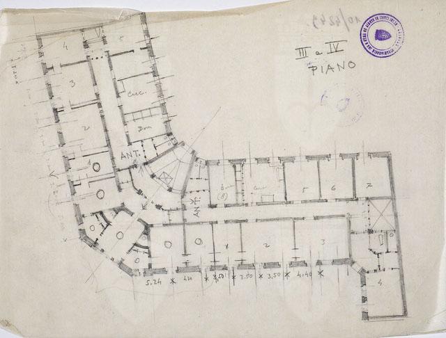 Disegno a matita raffigurante la planimetria del III e IV piano di un edificio per l'Istituto Nazionale d'Assicurazione per gli Infortuni sul Lavoro. Studio della distribuzione dell'edificio con definizione della destinazione d'uso (scritte all'interno dei locali).