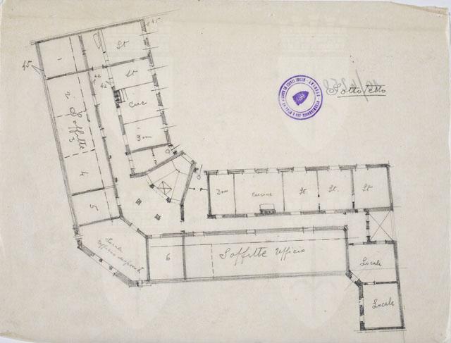 Disegno a matita raffigurante la planimetria del sottotetto di un edificio per l'Istituto Nazionale d'Assicurazione per gli Infortuni sul Lavoro. Studio della distribuzione dell'edificio con definizione della destinazione d'uso (scritte all'interno dei locali).