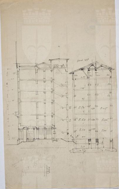 Si tratta di uno dei disegni della serie "Progetto per la costruzione della sede dell'Istituto Nazionale d'Assicurazione per gli Infortuni sul Lavoro in via Coroneo" eseguiti da Arduino Berlam, cfr. schede CMSAOAR10_4245 - CMSAOAR10_4271. Nel dicembre 1922 Arduino Berlam venne invitato a partecipare al concorso per la sede dell'Istituto Nazionale d'Assicurazione per gli Infortuni sul Lavoro, che sarebbe stata realizzata in via Coroneo a Trieste. Egli presentò la sua proposta il 14 marzo 1923, che non venne selezionata: fu preferito il progetto degli architetti Enrico e Umberto Nordio. Il disegno illustra lo schizzo delle sezioni dell'edificio. Per ulteriori considerazioni si rinvia alla tavola CMSAOAR10_4269.