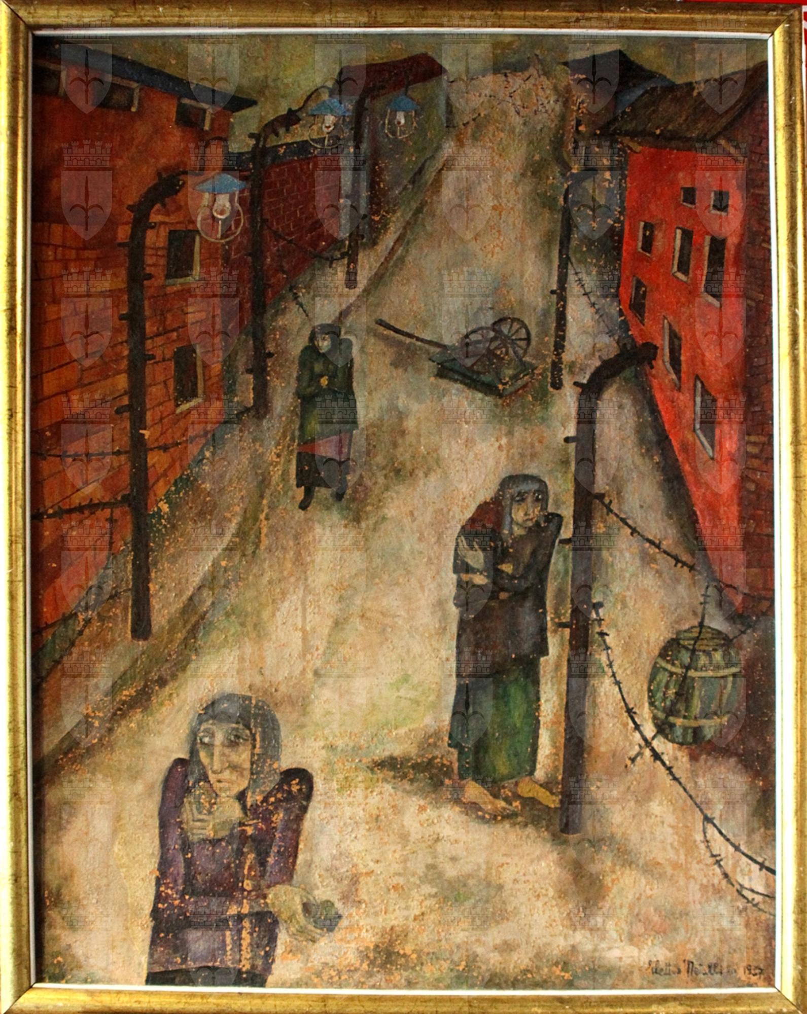 Sul verso dell'opera è apposto il cartellino dell'Associazione Giovanile Italiana – "Gorizia 6a mostra giovanile internazionale di arti figurative gorizia 1958 IIIa Biennale dei giovani n. 752 – autore Metallinò Elettra". Il titolo “Campo di concentramento” sembra coperto dalla vernice nera.