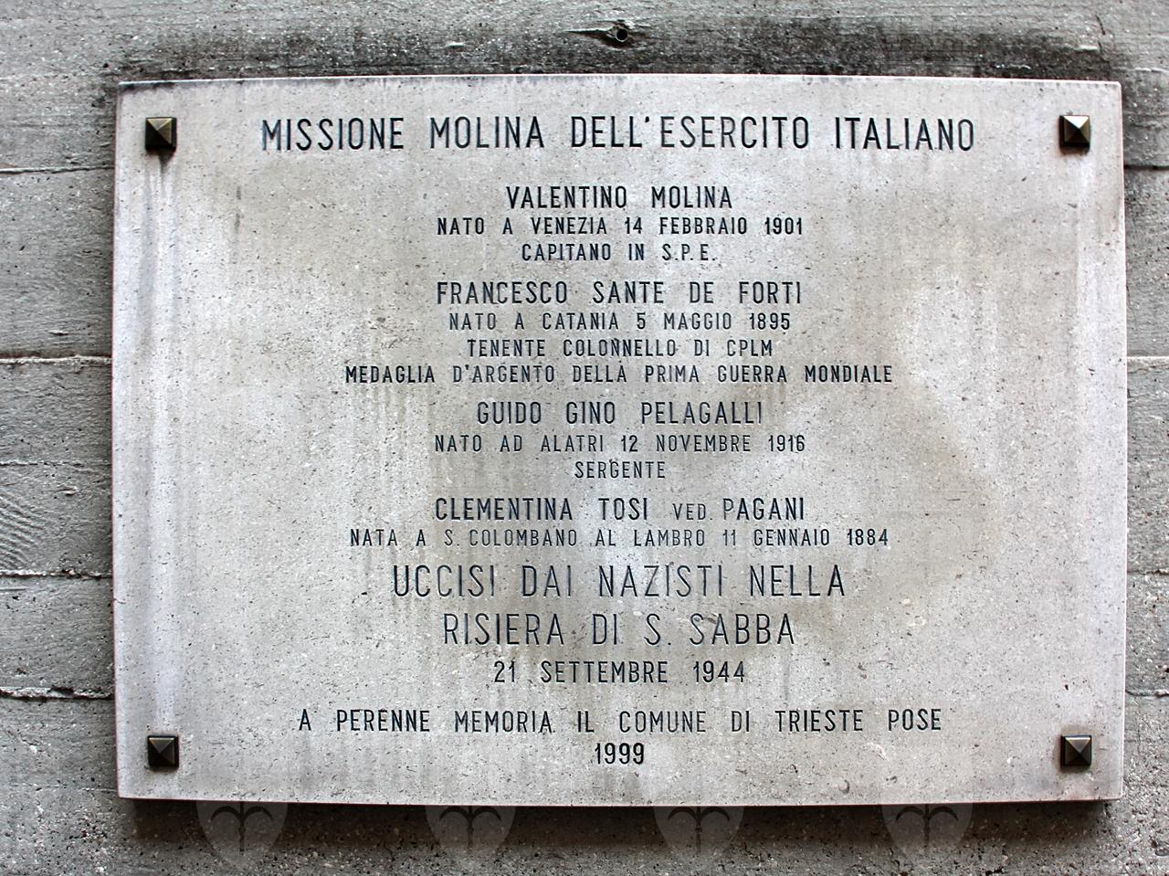 La targa ricorda i quattro caduti della missione alleata del capitano Valentino Molina: il capitano stesso, il tenente colonnello Francesco Sante De Forti, Guido Gino Pelagalli e la signora Clementina Tosi vedova Pagani, uccisi il 21 settembre 1944. La storia legata a questa vicenda riguarda la radio che trasmetteva dall'abitazione di Clementina Tosi di Trieste, in via Ireneo della Croce. La radio era stata portata a Trieste alla fine del gennaio del 1944 da Valentino Molina, capitano dei Bersaglieri e da Enzo Barzellato, radiotelegrafista della Marina. Da questa storia è tratto il libro per bambini "La trisnonna Clementina e la Risiera di San Sabba", edito a Trieste nel 2020.