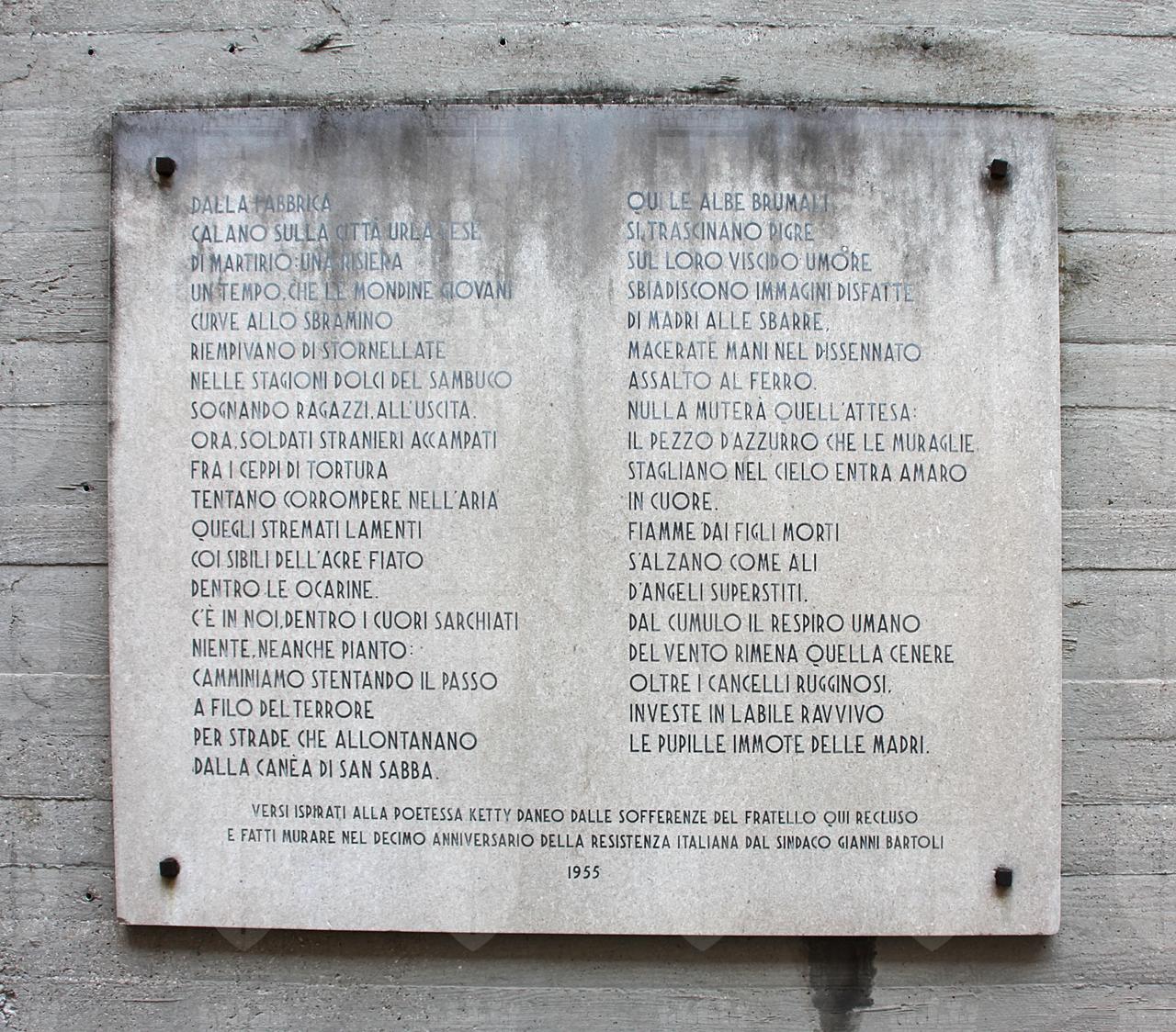 La poesia iscritta sulla lapide è intitolata "La Risiera di San Sabba"; l'autrice, Enrica Bon (Trieste 1908-1998), scrittrice e poetessa, era conosciuta con il nome d'arte di Ketty e con il cognome del marito, era infatti sposata con il pittore Renato Daneo (Trieste 1905-1978).