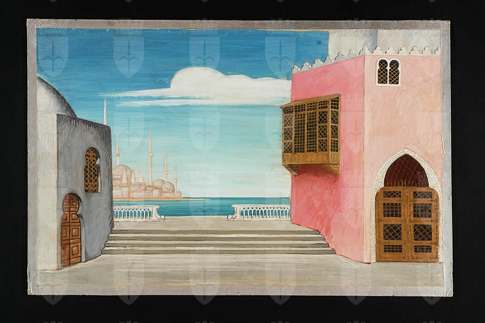 Il ratto dal serraglio di Wolfgang Amadeus Mozart. Palazzo del Pascià Selim con scorcio di mare e veduta di una casa turca