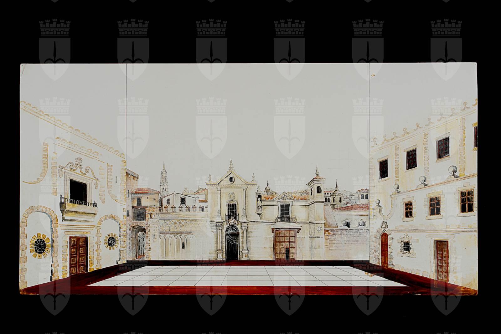 Il cordovano, atto unico di Goffredo Petrassi. Piazza lastricata, sullo sfondo facciate di palazzi con decori seicenteschi spagnoli