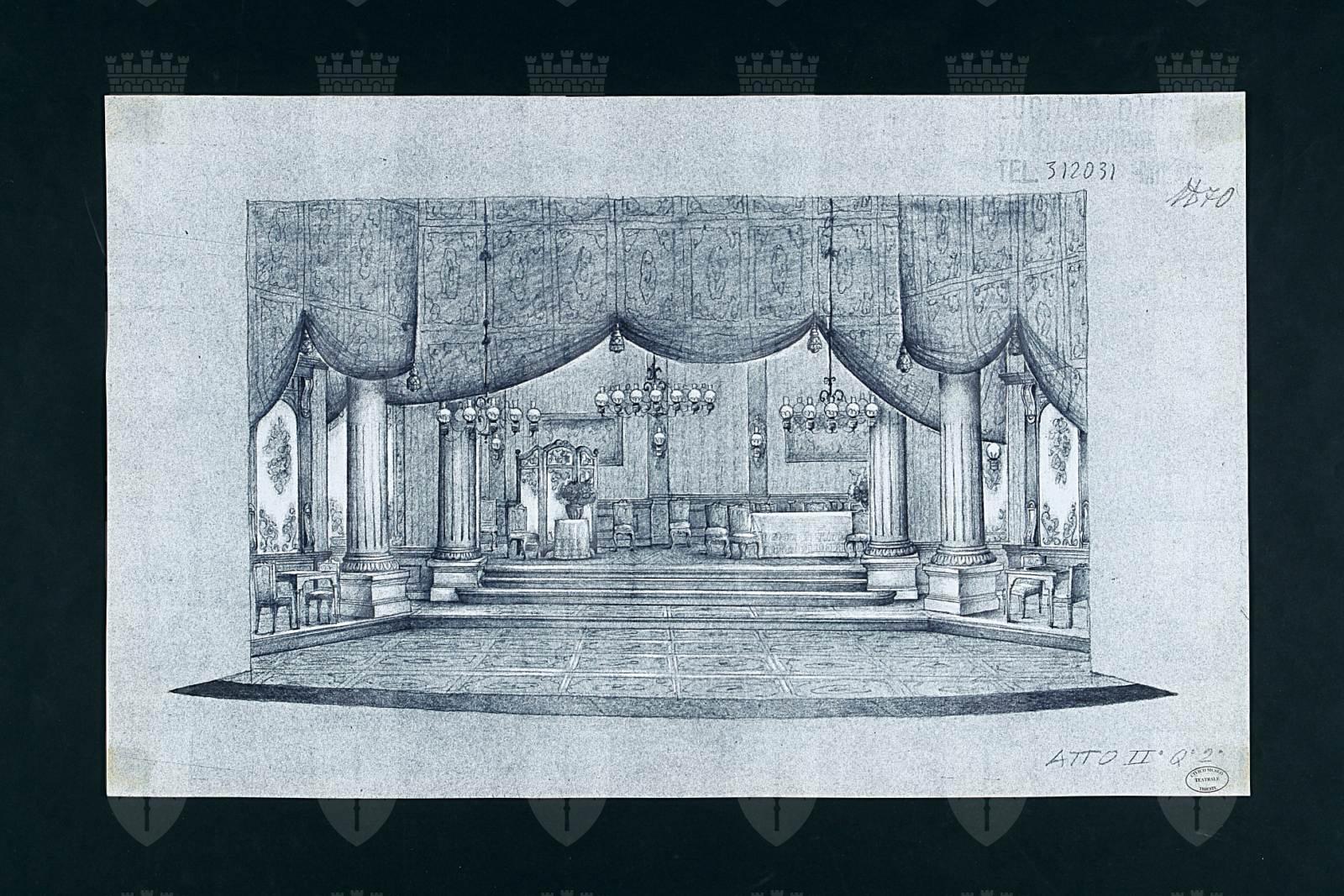 La traviata, opera in quattro atti di Giuseppe Verdi, atto 2, quadro 2. Salone colonnato disposto su tre piani collegati da gradini e scalinata centrale.