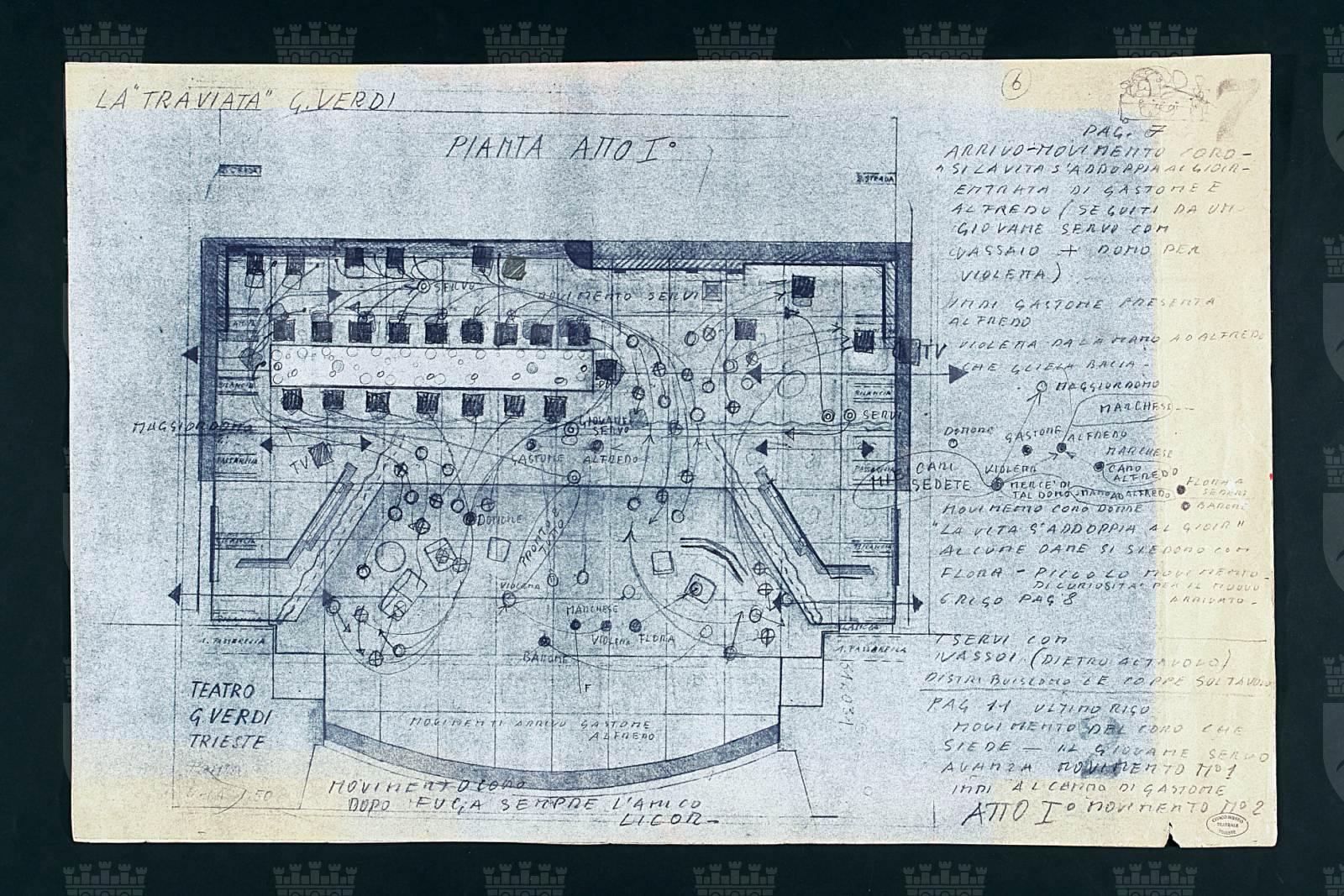 La traviata, opera in quattro atti di Giuseppe Verdi, atto 1. Disegno in scala 1:50 della sala descritta nella scheda CMT OA 75688 con indicazioni sui movimenti scenici degli interpreti e annotazioni