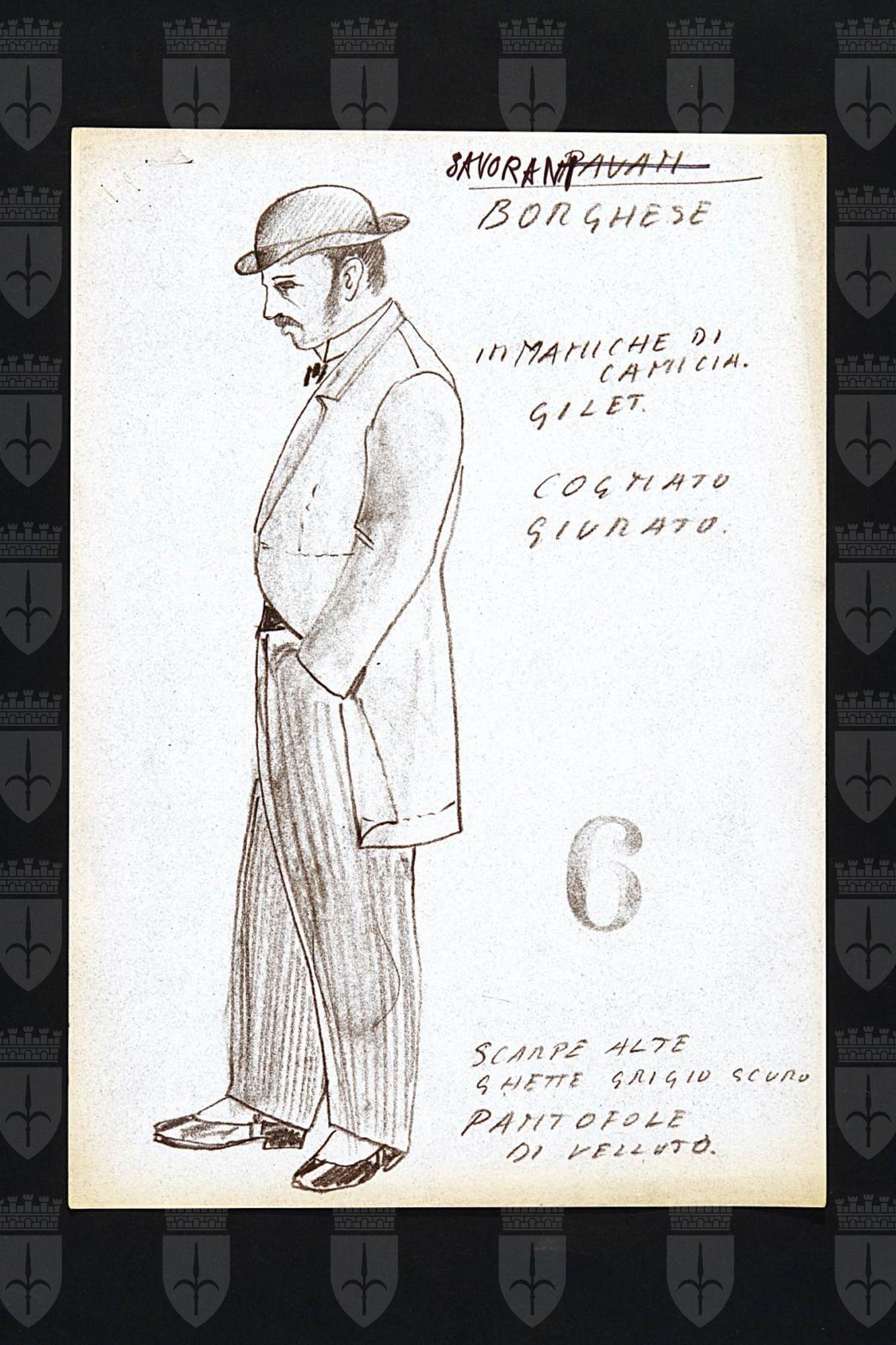 Motivo di scandalo e di riflessione, due tempi di John Osborne. Figura intera maschile con bombetta, giacca, calzoni rigati