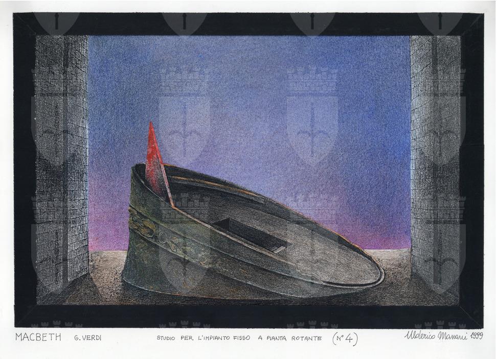 Macbeth, opera lirica di Giuseppe Verdi. Imponente impianto scenico a pavimento, in pendenza verso destra, a forma di corona circolare, senza punte, occupa tutto lo spazio scenico. Ai lati due mura alte con fessura centrale per il passaggio. Al centro della corona botola aperta, luce viola/ blu