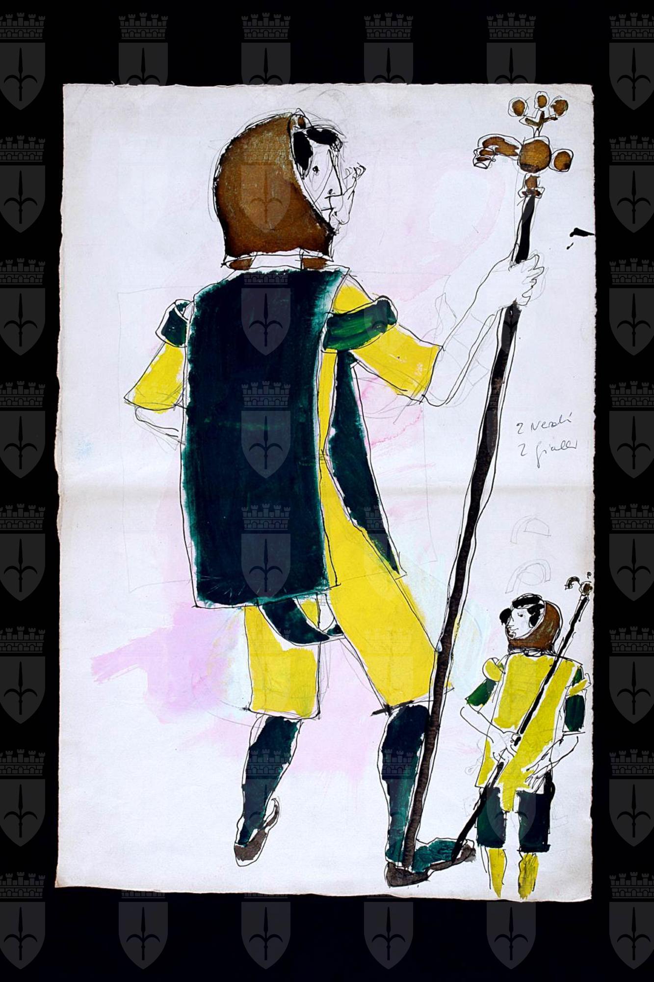L'augellin Belverde, testo teatrale di Carlo Gozzi, due figure intere, una grande e una piccola, con lo stesso abito ma i colori invertiti, calzamaglia, brache, corazza, copricapo (elmo), alto bastone pastorale con pomo decorato