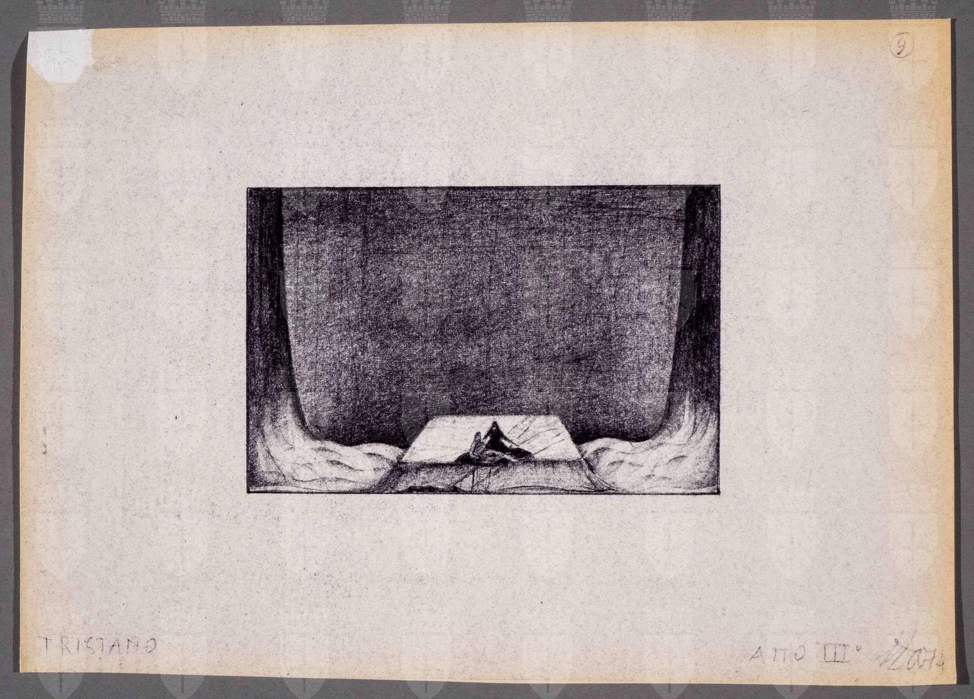 Tristano e Isotta, opera di Richard Wagner. Atto 3. Pedana trapezoidale al centro con due figure. Veli scendono dal soffitto creando un gioco di pareti morbide ai lati che vanno a confondersi con le onde del mare a pavimento.