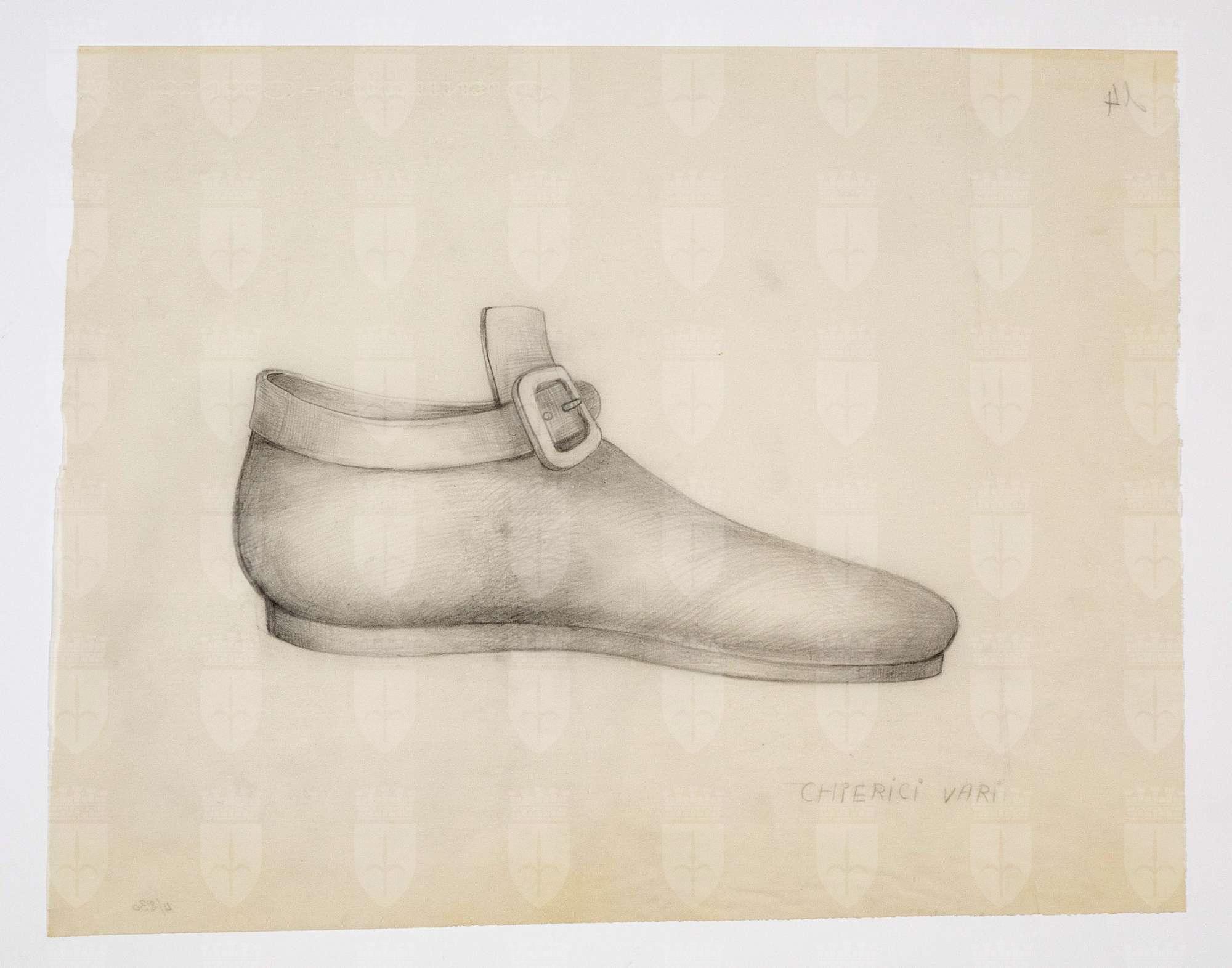 Il gioco dei potenti, libero adattamento di Giorgio Strehler da Enrico VI, dramma storico di William Shakespeare, in 15 atti e 2 giornate. Calzatura bassa con fibbia e linguetta alta, di profilo verso destra.