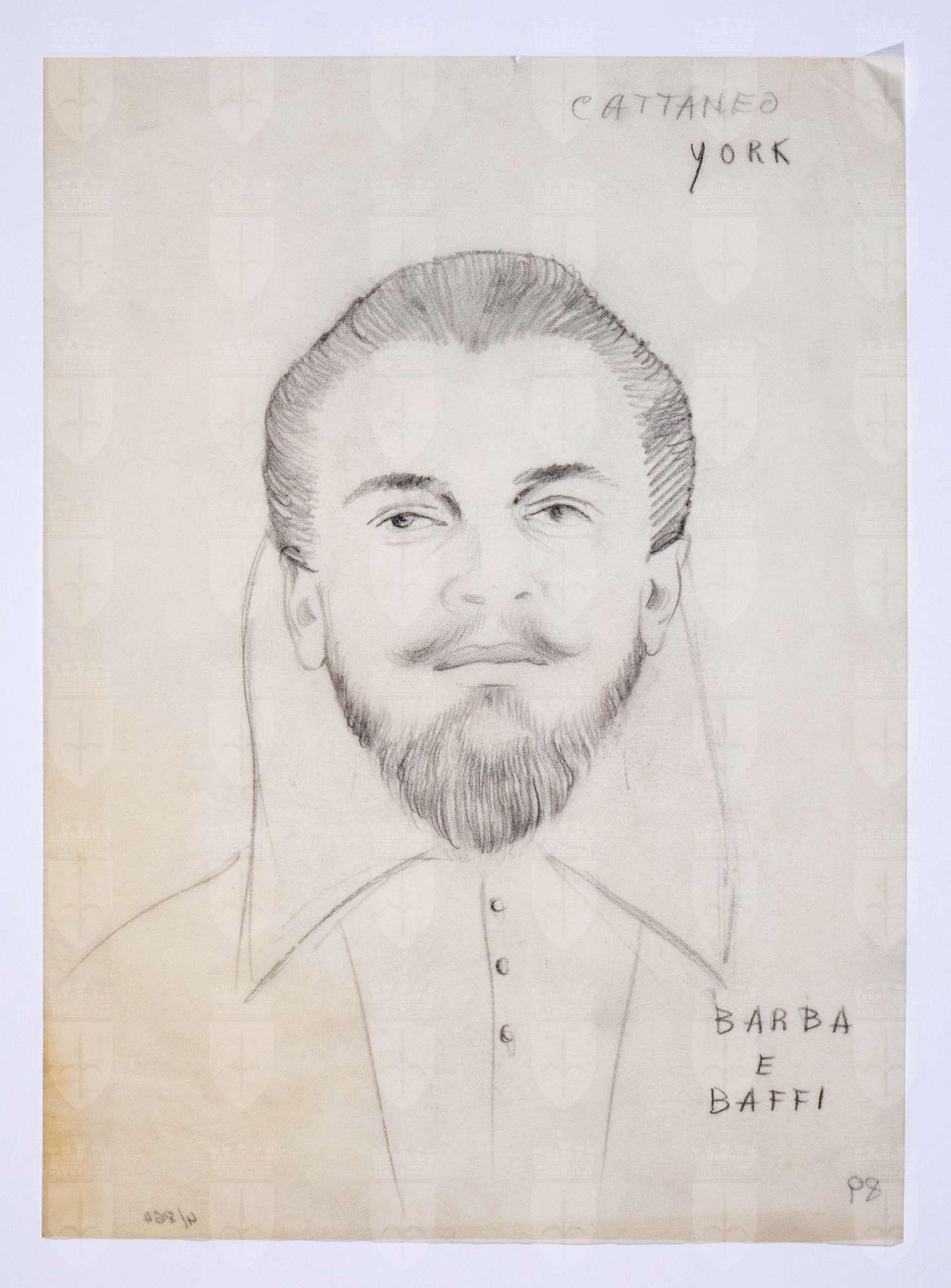 Il gioco dei potenti, libero adattamento di Giorgio Strehler da Enrico VI, dramma storico di William Shakespeare, in 15 atti e 2 giornate. Ritratto di testa maschile di fronte con testa scoperta, barba e baffi, colletto a punta rialzato sul retro.