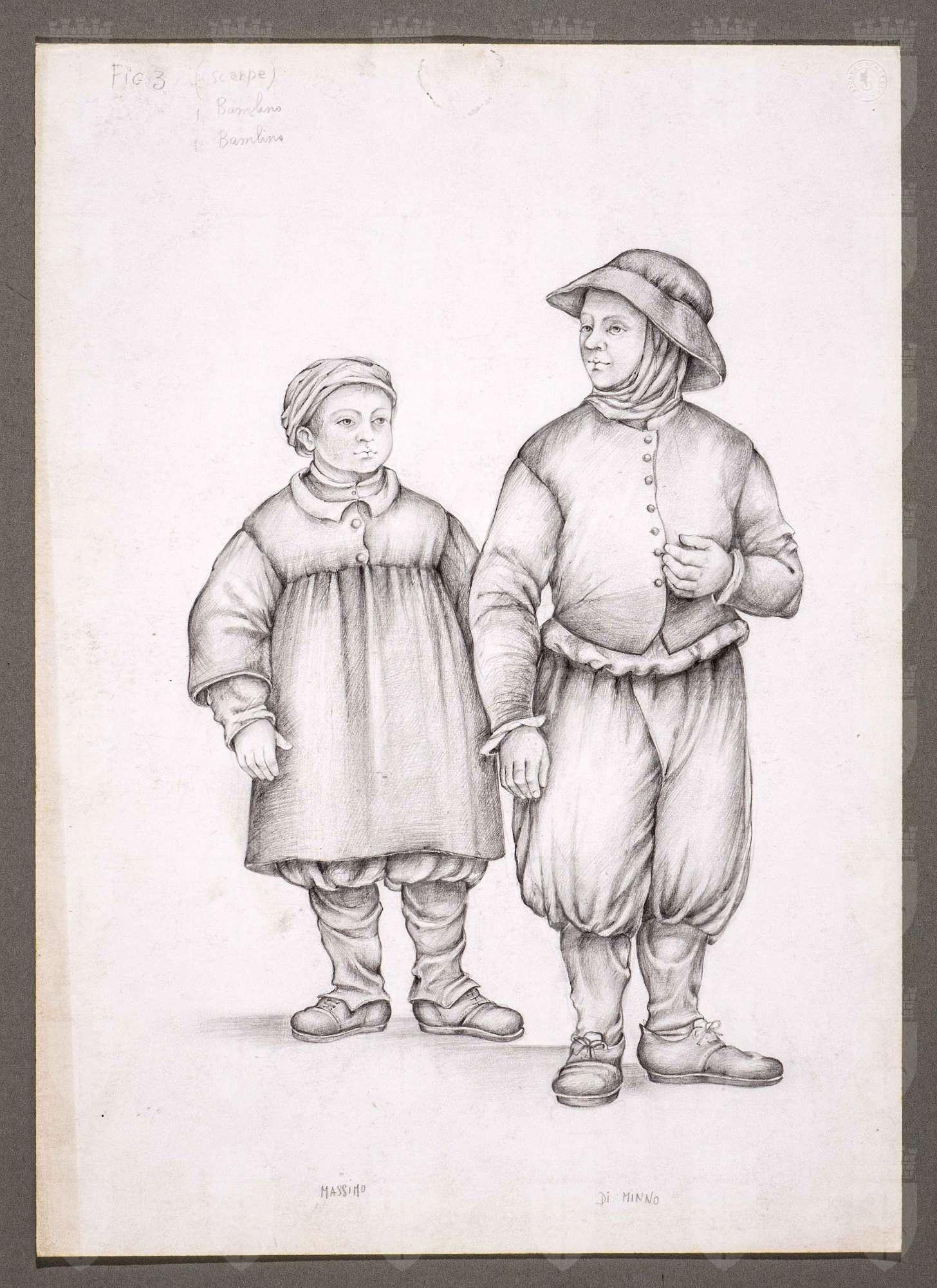 Il gioco dei potenti, libero adattamento di Giorgio Strehler da Enrico VI, dramma storico di William Shakespeare, in 15 atti e 2 giornate. Due bambini di fronte, a sinistra una bambina col capo coperto da piccolo turbante indossa un abito ampio al ginocchio e vita alta. A destra un bambino di statura più alta indossa un cappuccio coperto da copricapo piatto, un giacchino con numerosi piccoli bottoni e brache al ginocchio.