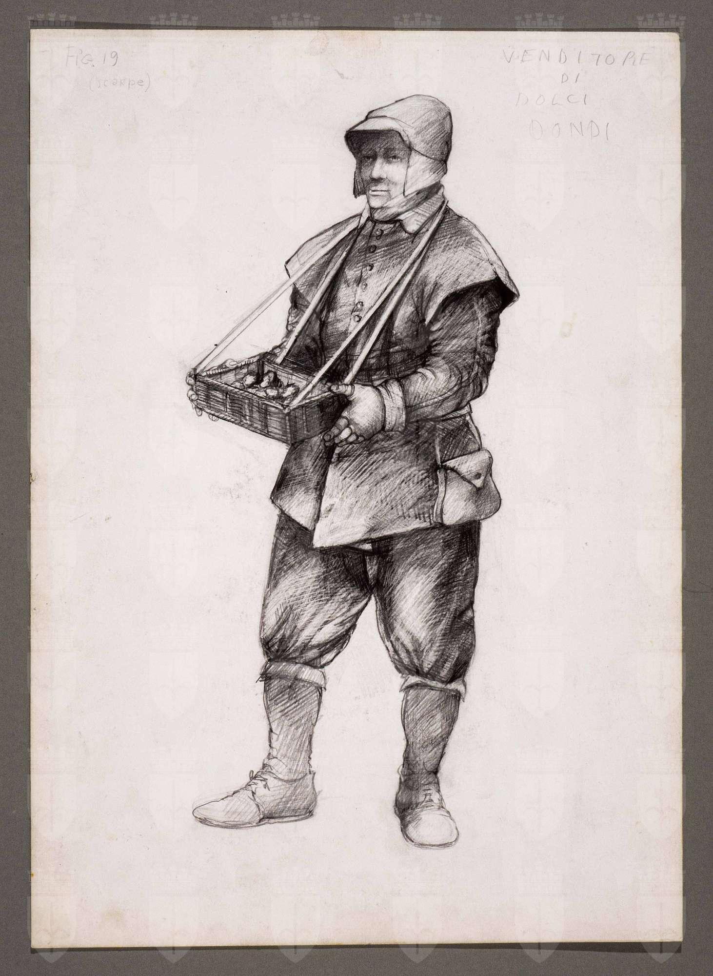Il gioco dei potenti, libero adattamento di Giorgio Strehler da Enrico VI, dramma storico di William Shakespeare, in 15 atti e 2 giornate. Figura maschile in piedi, di tre quarti verso sinistra. Indossa un copricapo a cappuccio con frontino e paraorecchie, una giubba con spalle spioventi, guanti senza dita, brache al ginocchio, calze grosse. Porta una borsa legata al suo fianco destro e, sul davanti, un cestino rettangolare con dolciumi appeso al collo da una doppia cinghia