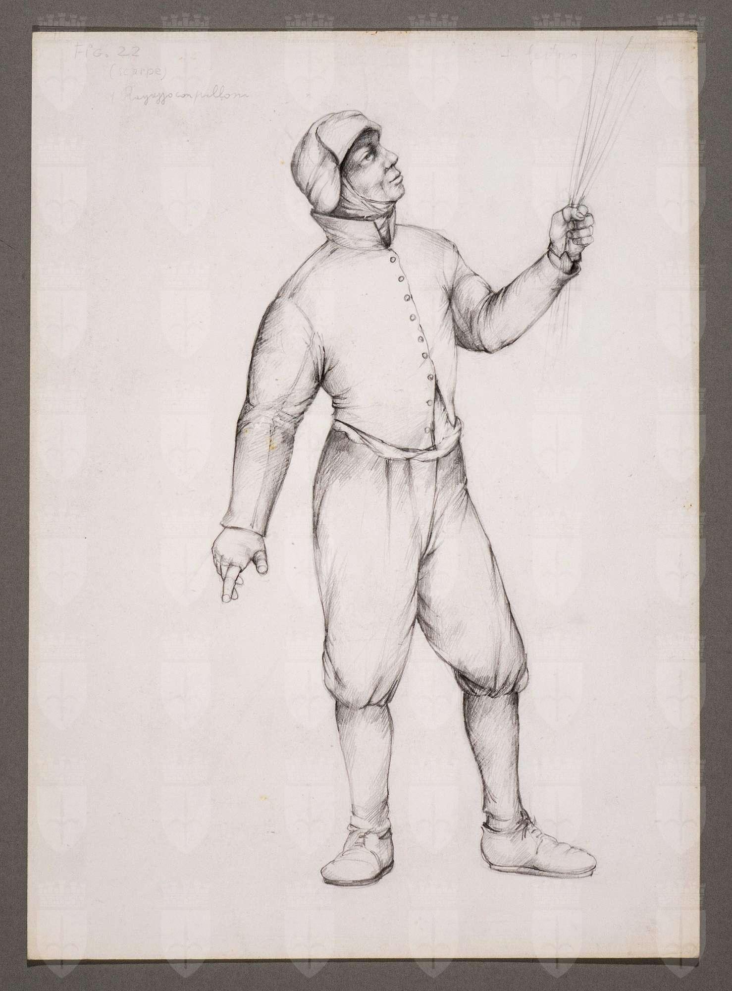 Il gioco dei potenti, libero adattamento di Giorgio Strehler da Enrico VI, dramma storico di William Shakespeare, in 15 atti e 2 giornate. Figura maschile in piedi girata verso destra e lo sguardo rivolto in alto. Indossa un copricapo a cuffia sopra un soggolo, una giubba corta, brache al ginocchio, calze grosse, guanti senza dita. Tiene numerosi palloncini con la mano sinistra.