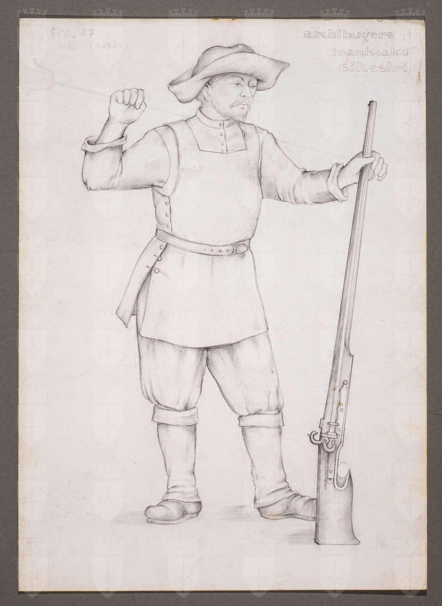 Il gioco dei potenti, libero adattamento di Giorgio Strehler da Enrico VI, dramma storico di William Shakespeare, in 15 atti e 2 giornate. Figura maschile in piedi, di tre quarti verso destra. Indossa un cappello piatto floscio a larghe falde, una camicia, un gilet lungo abbottonato sul fianco e chiuso in vita da una cintura, brache al ginocchio e ghette alte al ginocchio. Regge con la sua mano destra uno spiedo, posato di traverso sulle spalle e con la mano sinistra un archibugio tenuto in piedi, appoggiato a terra con la canna rivolta verso l'alto.