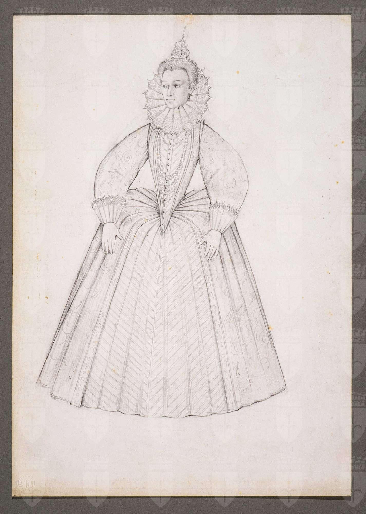 Il gioco dei potenti, libero adattamento di Giorgio Strehler da Enrico VI, dramma storico di William Shakespeare, in 15 atti e 2 giornate. Figura femminile in piedi di fronte, con il capo e lo sguardo leggermente girati verso sinistra. Nobile dama con abito ricco, costituito da collaretta in pizzo inamidato a gorgiera, corpetto a cono, maniche a prosciutto con alti polsini in pizzo, verdugale a ruota, alto diadema a punta sul capo, collane.