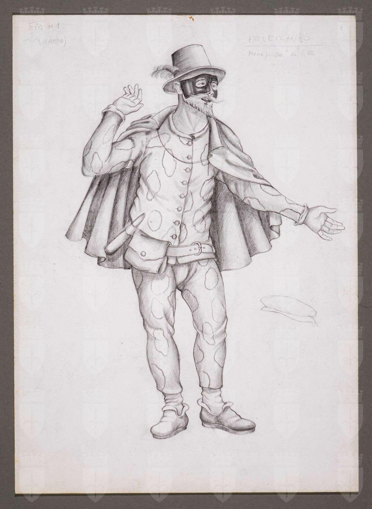 Il gioco dei potenti, libero adattamento di Giorgio Strehler da Enrico VI, dramma storico di William Shakespeare, in 15 atti e 2 giornate. Figura maschile in piedi, leggermente di tre quarti verso destra in costume di Arlecchino. Indossa un cappello a cilindro piumato, un abito a pezze tondeggianti irregolari formato da casacca e calzoni, un mantello corto. La parte alta del viso sopra i baffi e la barba a punta è coperta da una maschera. In vita porta una cintura alla quale sono infilati un manganello e una piccola borsa. Schizzo di un secondo cappello a destra della figura, al centro.