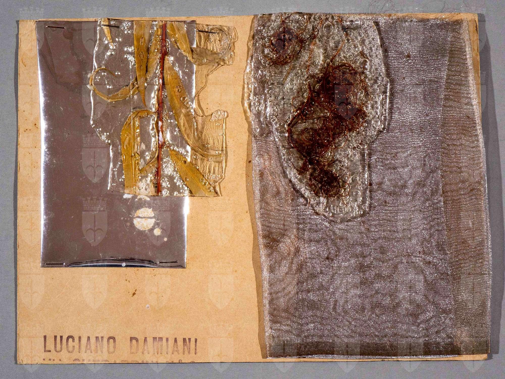 Die Zauberflöte, Singspiel di Emmanuel Schikaneder e Wolfgang Amadeus Mozart. Studo per la realizzazione dei "teli-palma". Materiale vegetale inglobato in due colate di colla, posizionate l'una, a sinistra, su cartoncino di alluminio e l'altra, a destra, su un tulle cangiante.
