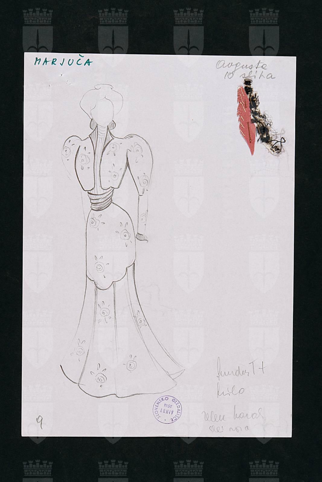 La coscienza di Zeno (Zenova Izpoved), di Italo Svevo nel rifacimento scenico di Tullio Kezich. Costume per Augusta. Figura femminile intera, gonna lunga e giacchina a motivi floreali, camicia a collo alto, fascia drappeggiata in vita