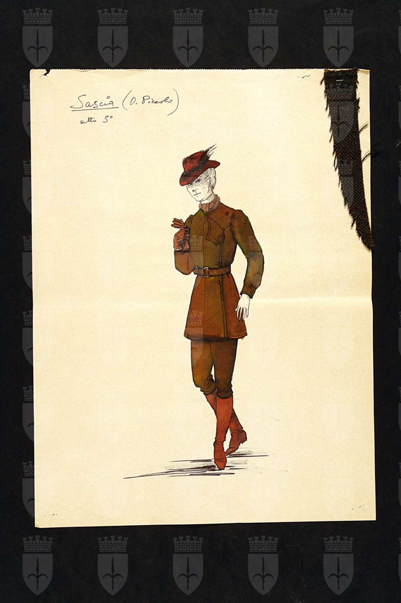 Ivanov, testo teatrale di Anton Cechov. Personaggio: Sasha. Abito maschile color marrone. Giacca con abbottonatura laterale, pantaloni inseriti in stivali. Cappellino con piuma, guanti, foulard al collo cintura.