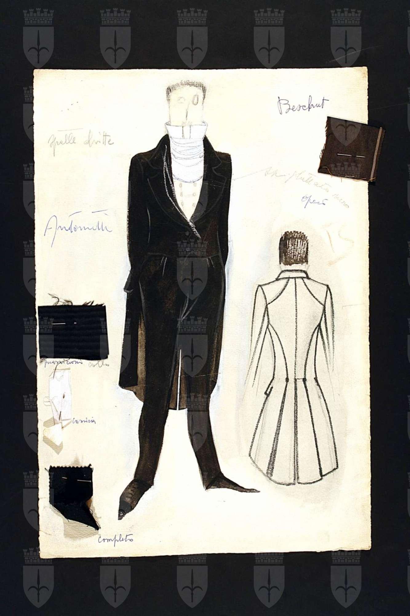 La cagnotte, testo teatrale di Eugène Labiche. Figurino per Béchut, figura maschile intera di fronte. Abito scuro, a destra studio del retro della giacca
