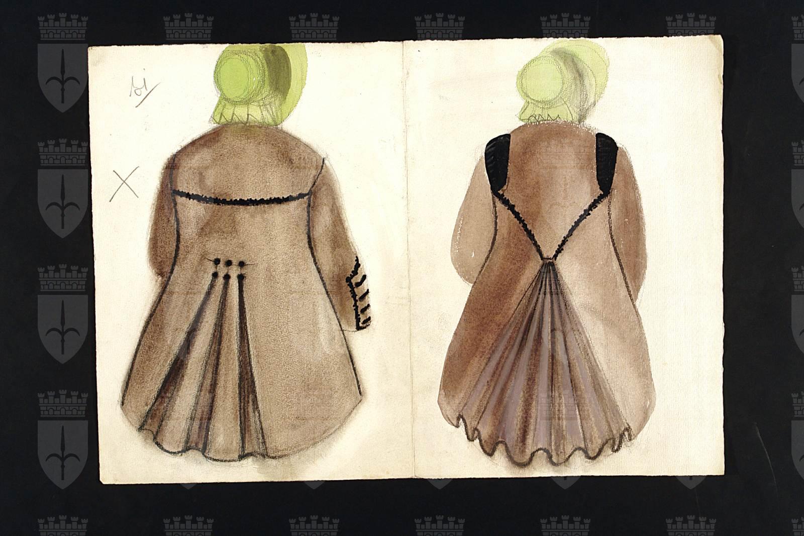 La cagnotte, testo teatrale di Eugène Labiche. Figurino per Léonida, 2 figure femminili non complete nella parte inferiore, viste da dietro. Medesimo cappotto di CMT_OA_4_000400 e CMT_OA_4_000401