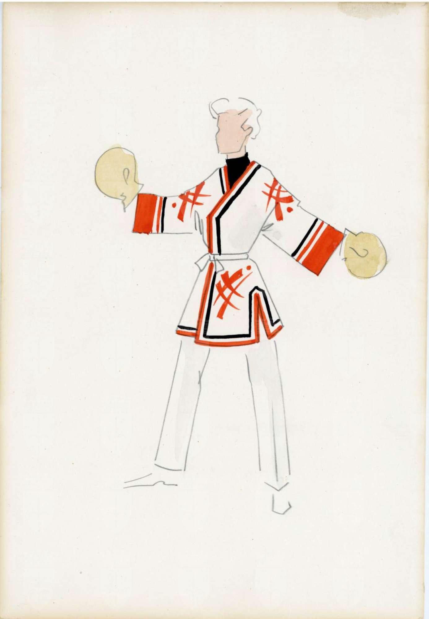 Cin-Ci-Là, operetta di Virgilio Ranzato, Figurino per costume maschile cinese, ambientazione Macao 1925. Casacca a chimono con cintura in vita e spacchi laterali su maglia nera e collo alto. Pantalone bianco di foggia occidentale. COlori bianco, rosso, nero, decorazioni geometriche e grafismi, Indossa guantoni da boxe