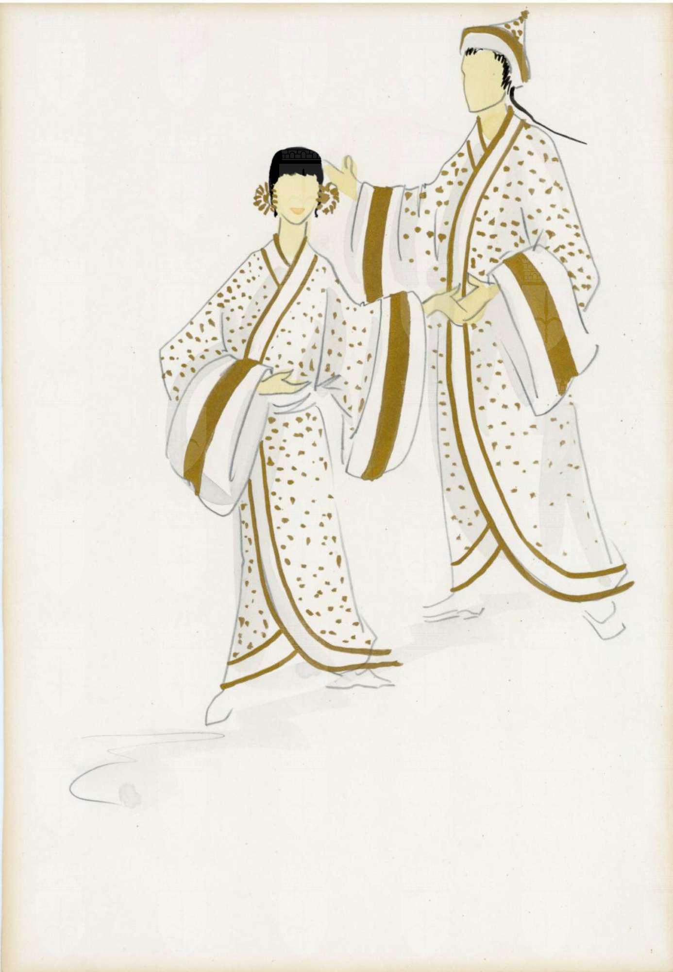 Cin-Ci-Là, operetta di Virgilio Ranzato, Figurini di costumi maschile e femminile cinese, ambientazione Macao 1925. A destra figura maschile intera, a sinistra figura femminile intera. Abiti identici a chimono di colori bianco e oro, bordature ornamentali dorate, copricapo a pagoda per la figura maschile, acconciatura floreale per quella femminile
