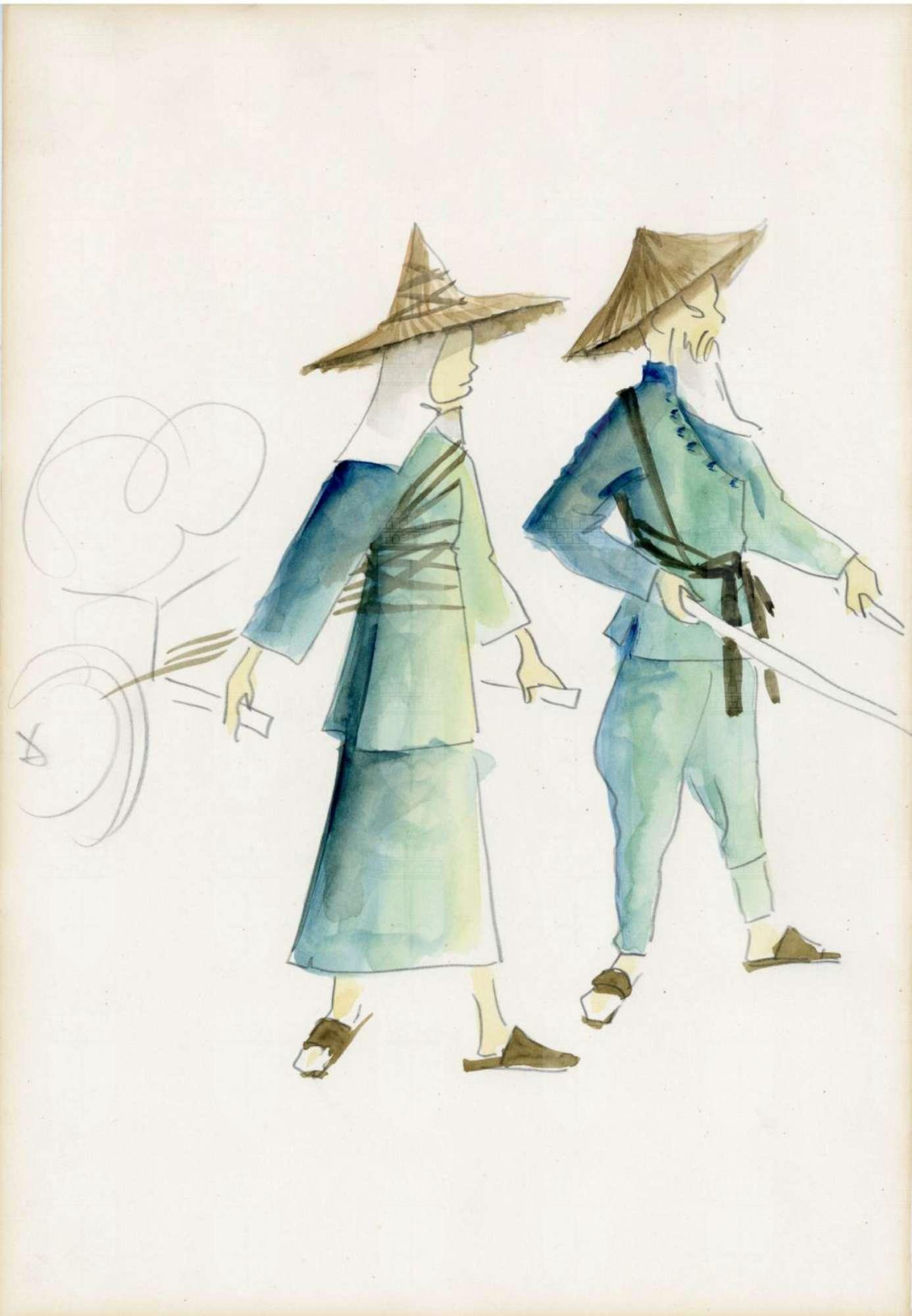 Cin-Ci-Là, operetta di Virgilio Ranzato, Figurini di costumi maschile e femminile cinese abbinati, ambientazione Macao 1925. A destra figura maschile intera nell'atto di spingere un carretto, indossa casacca verde azzurra accollata con abbottonatura laterale, fascia in tessuto, pantalone stretto alla caviglia, sandali, cappello a pagoda. A sinistra figura femminile intera nell'atto di trasportare un carretto sul retro, indossa casacca verdee azzurra con spacchi laterali, gonna al polpaccio, stringhe, sandali, ampio cappello.