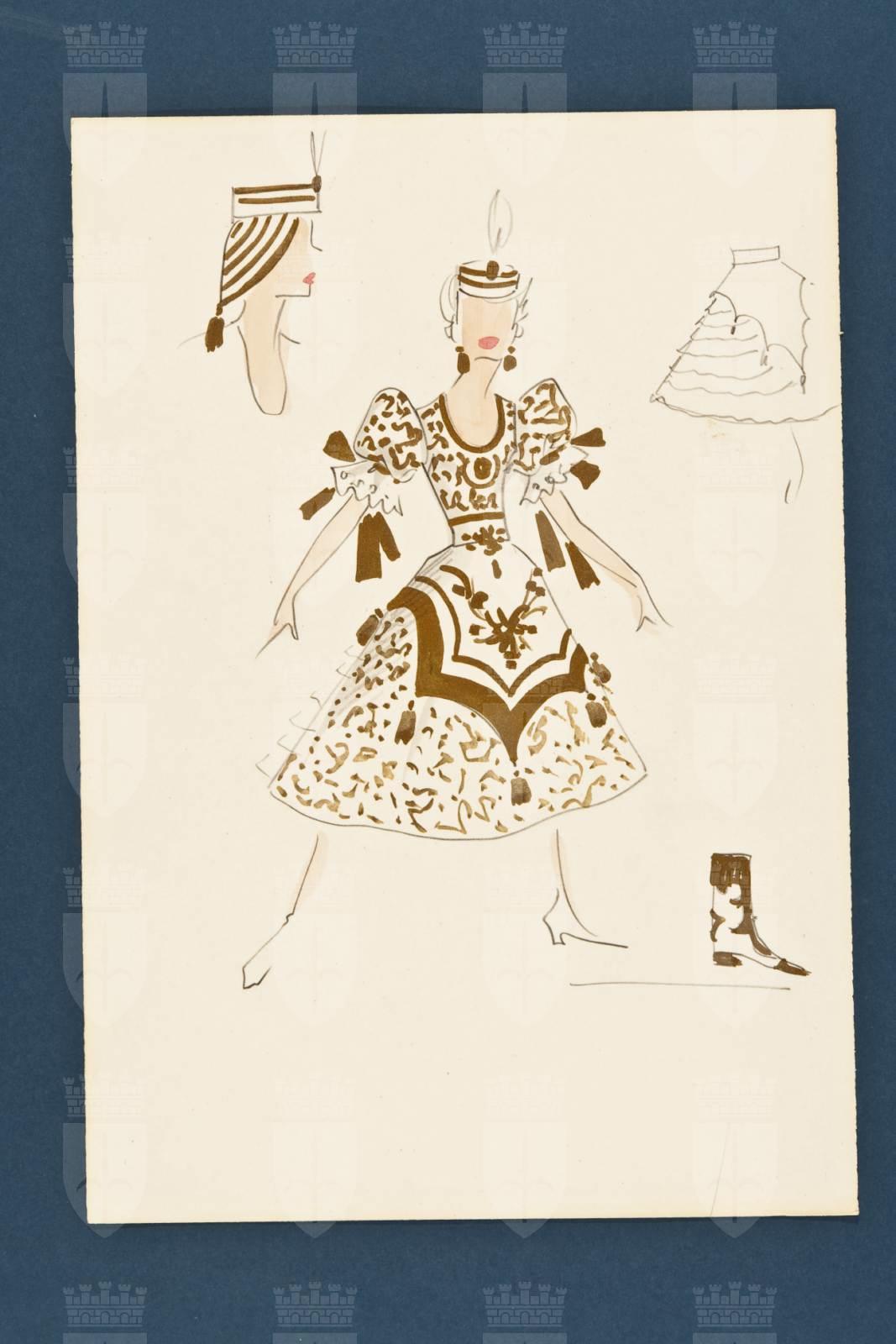 La contessa Mariza, figura femminile, indossa un copricapo con pennacchio, abito a scollo ovale, manica corta a palloncino con balza in pizzo e astri pendenti. Gonna ampia al ginocchio e grembiule ornamentale a grandi cappe e nappe. Ricchi decori dorati, Sui bordi schizzi dei particolari di accessori: copricapo, gonna, stivale