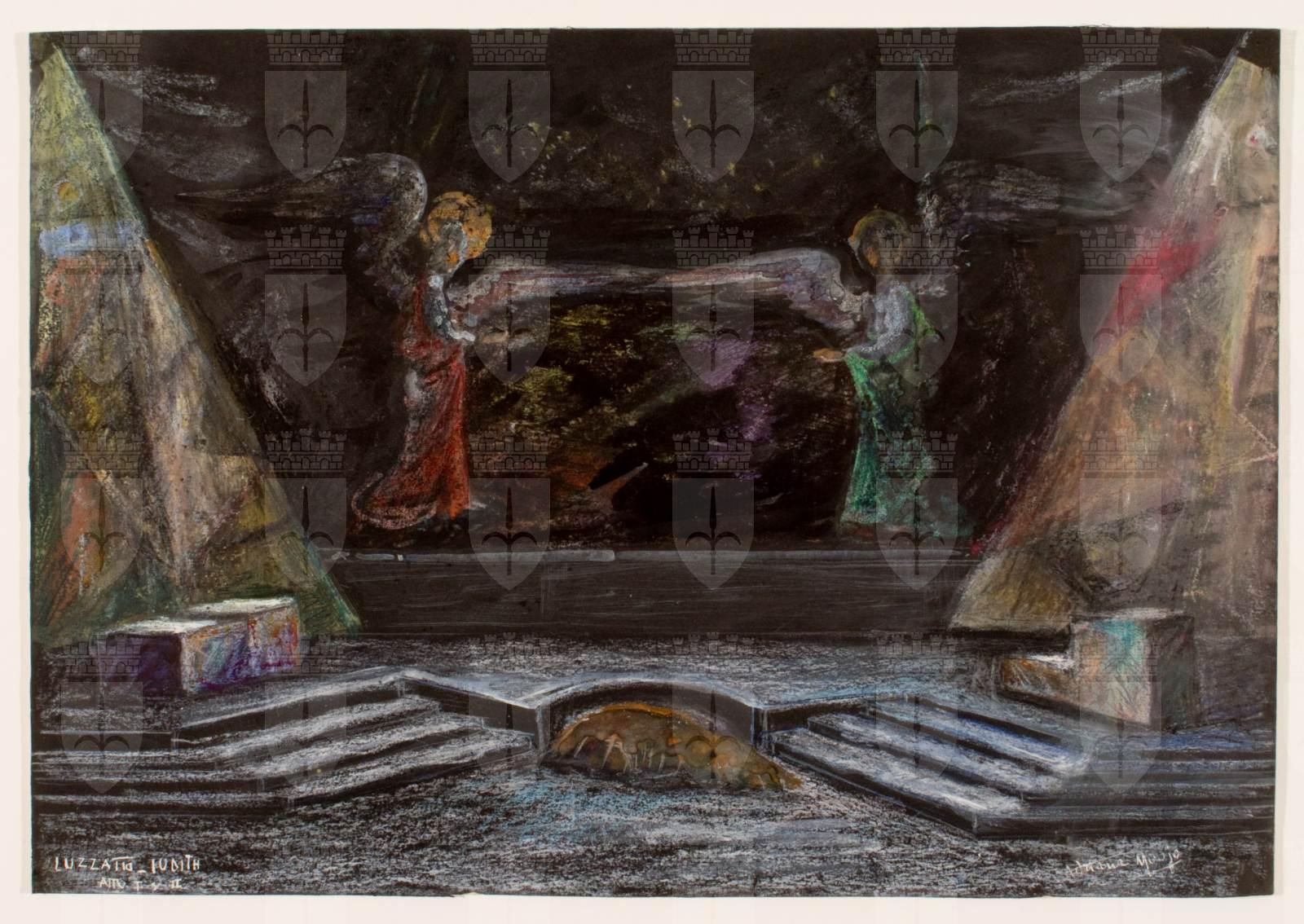 Judith, dramma biblico di Livio Luzzatto, atto 1., scena 2. Tenda di Judith e accampamento di due tende ai lati. Sul fondo cielo notturno e due angeli