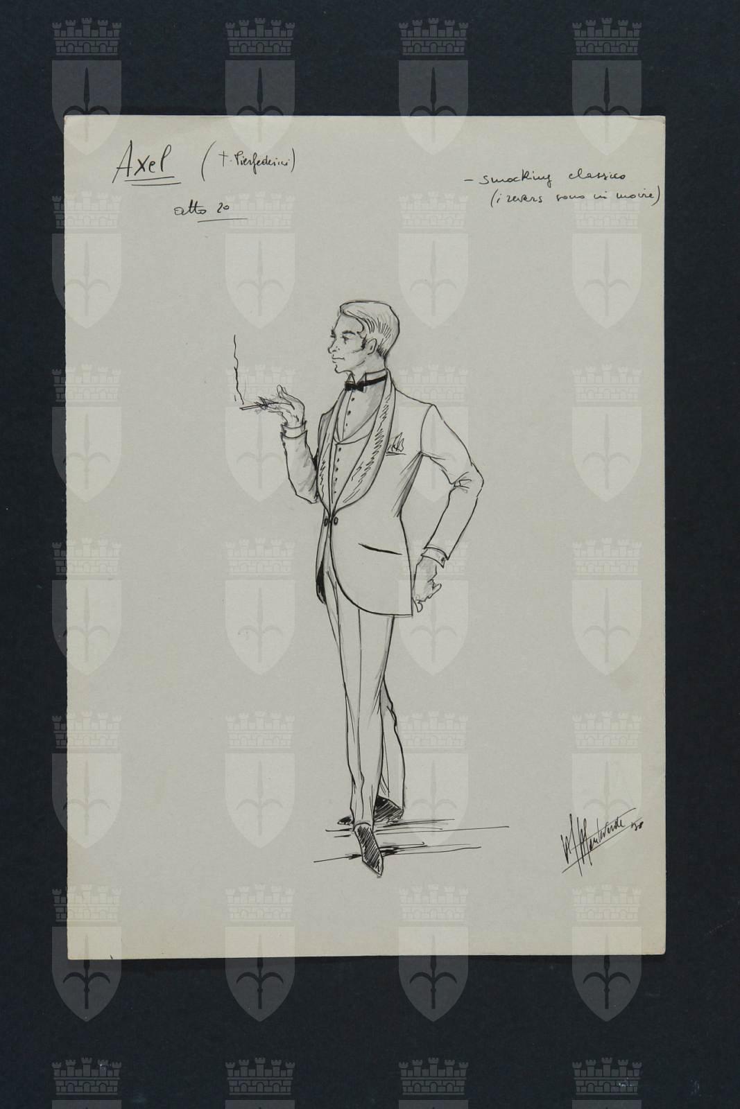 Davide e Golia, opera di Georg Kaiser. Disegno per figurino per il personaggio di Axel. Figura maschile ruotata a destra, indossa smoking, camicia con cravatta a farfalla, gilè, scarpe nere, fazzoletto al taschino, sigaretta accesa nella mano destra.