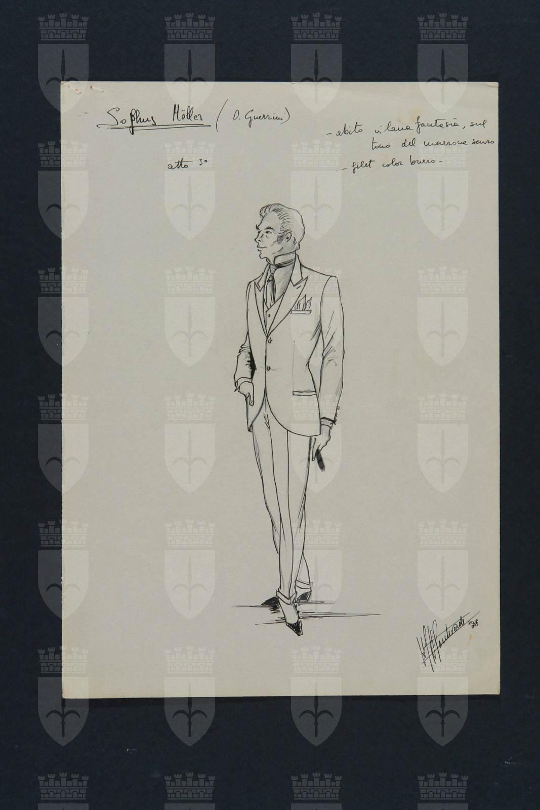 Davide e Golia, opera di Georg Kaiser. Disegno per figurino per il personaggio di Sophus Möller. Figura maschile leggermente ruotata a destra, indossa camicia a collo alto con cravatta, giacca, pantalone lungo, scarpe a punta. Sotto il braccio destro tiene una cartella