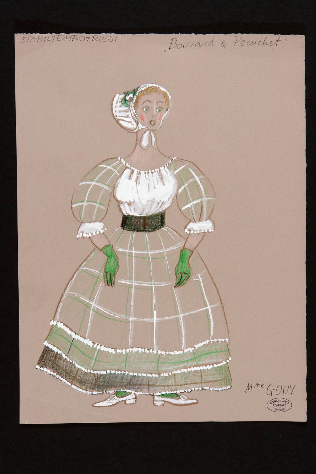 Bouvard e Pecuchet di Tullio Kezich e Luigi Squarzina da Gustave Flaubert. Personaggio: Madame Gouy. Figura femminile intera, abito ottocentesco con cuffia bianca con allacciatura a nastro e fiori ornamentali, abito a scollo circolare su bustino bianco, maniche rigonfie in tessuto a grandi riquadri, lunghezze al gomito, bordate di bianco, guanti verdi, cintura verde-bruna, gonna a riquadri su armatura con sottogonne uguali in varianti di colore, scarpe bianche con fibbie