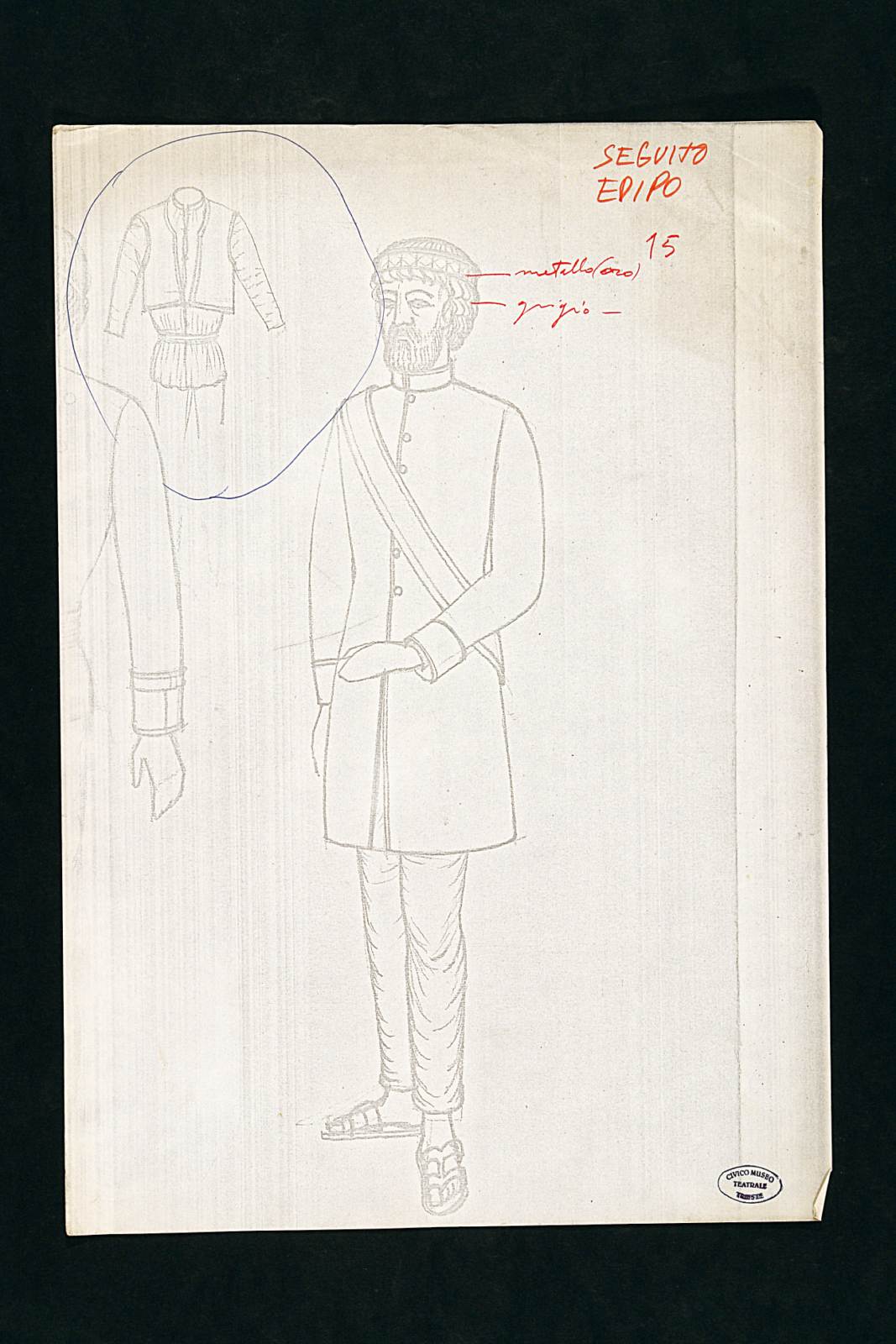 Edipo Re di Sofocle, figura maschile intera, indossa una calotta rigida con fascia frontale a decori geometrici; abito a manica lunga con risvolti ai polsi, colletto circolare rigido, abbottonatura centrale, fascia, pantaloni alla caviglia, sandali. In alto piccolo disegno con casacca e giacchino, altra sezione laterale lungo il bordo