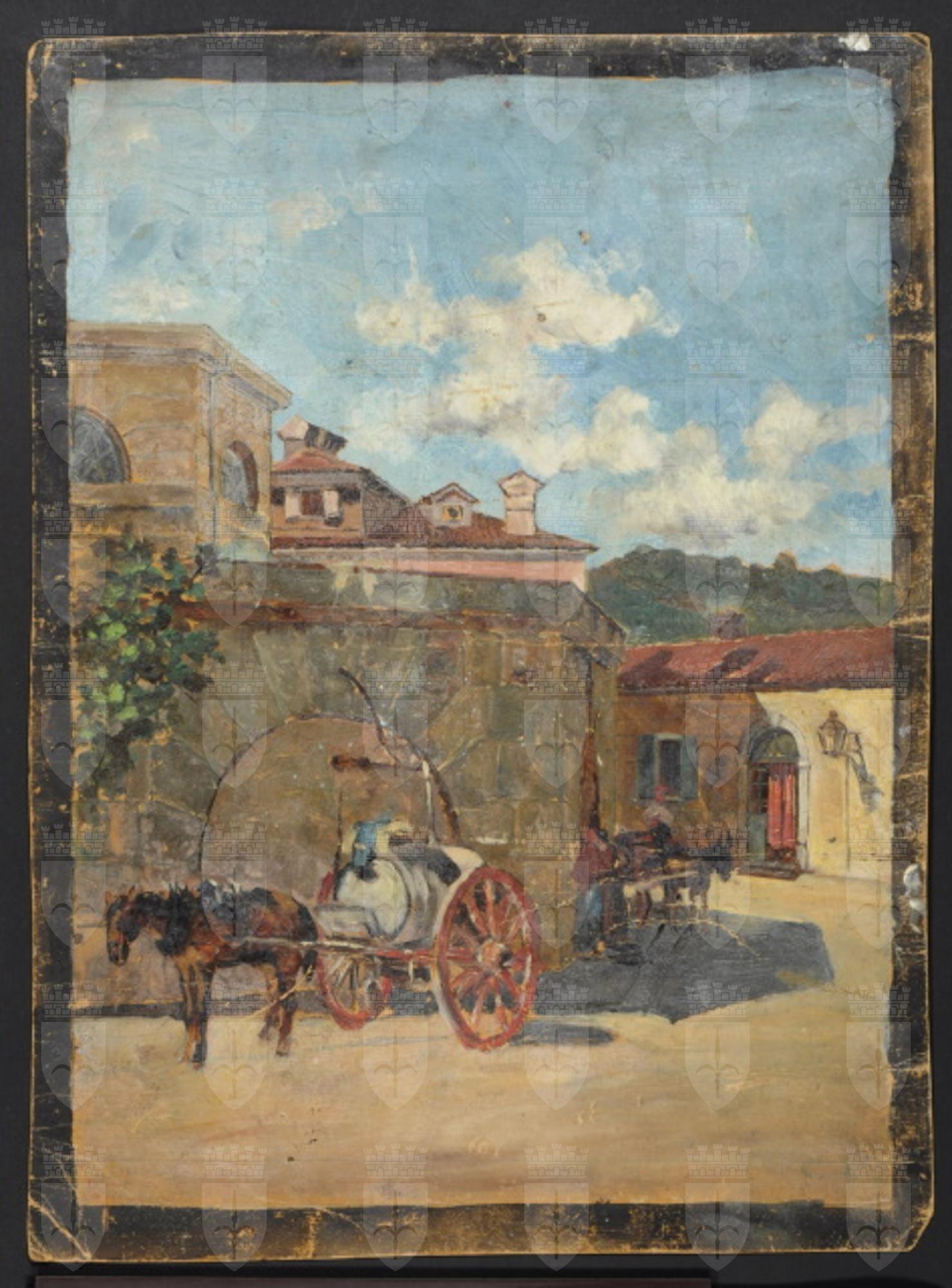 Come attestato da una scritta sul verso, il bozzetto ad olio su cartoncino è del pittore triestino Ernesto Croci ed è preparatorio per un dipinto, firmato e datato "Ern. Croci / 89", per ora di ubicazione ignota ma la cui esistenza è documentata da una foto dei CMSA (inv. 64/41097). Una scritta sul retro della foto dichiara che il dipinto fu esposto nel 1892 all'Esposizione Generale delle Belle Arti di Barcellona. Qui l'artista raffigurò uno scorcio della Piazza della Fontana della Zonta, oggi non più esistente, che era situata all'incrocio tra le vie della Zonta e Valdirivo: sulla sinistra si vede la mole della fontana in pietra, costituita da un corpo centrale ottagonale con copertura a spioventi e finestre a mezza luna circondato da un corpo più basso anch'esso ottagonale e mosso da arcate cieche a bugnato. La fontana fu costruita nel 1822 da Valentino Valle e Angelo Torian sul sito di una precedente fontana risalente al 1787, ricostruita nel 1821 dal capo muratore Felice Somazzi ma subito crollata per un violento nubifragio e per imperizia del Somazzi. Nel 1889 il Consiglio municipale ne decretò la sua demolizione e perciò il Croci in quest'opera ne volle documentare l'esistenza, prima che andasse distrutta (cfr. Fontane a Trieste, 1994). L'edificio basso sulla destra dovrebbe essere la corderia situata un tempo in via del Torrente (attuale via Carducci). Rispetto al bozzetto, databile anch'esso nel 1889, il dipinto presenta alcune leggere varianti nell'aggiunta in primo piano di un contadino in piedi visto di schiena accanto al carro con una botte trainato da un cavallo, e nelle due figure femminili in secondo piano intente a conversare.