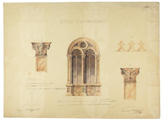 Il disegno fu eseguito nel 1858 a Venezia dall'architetto Domenico Pulgher durante gli anni giovanili, quando studiava all'Accademia di Belle Arti della città lagunare. L'acquerello è infatti un tipico studio accademico di una bifora di un palazzo veneziano di stile rinascimentale per ora non identificato e dei capitelli delle sue paraste laterali. Inoltre in alto a destra il Pulgher disegnò anche un particolare della merlatura di coronamento dell'edificio.