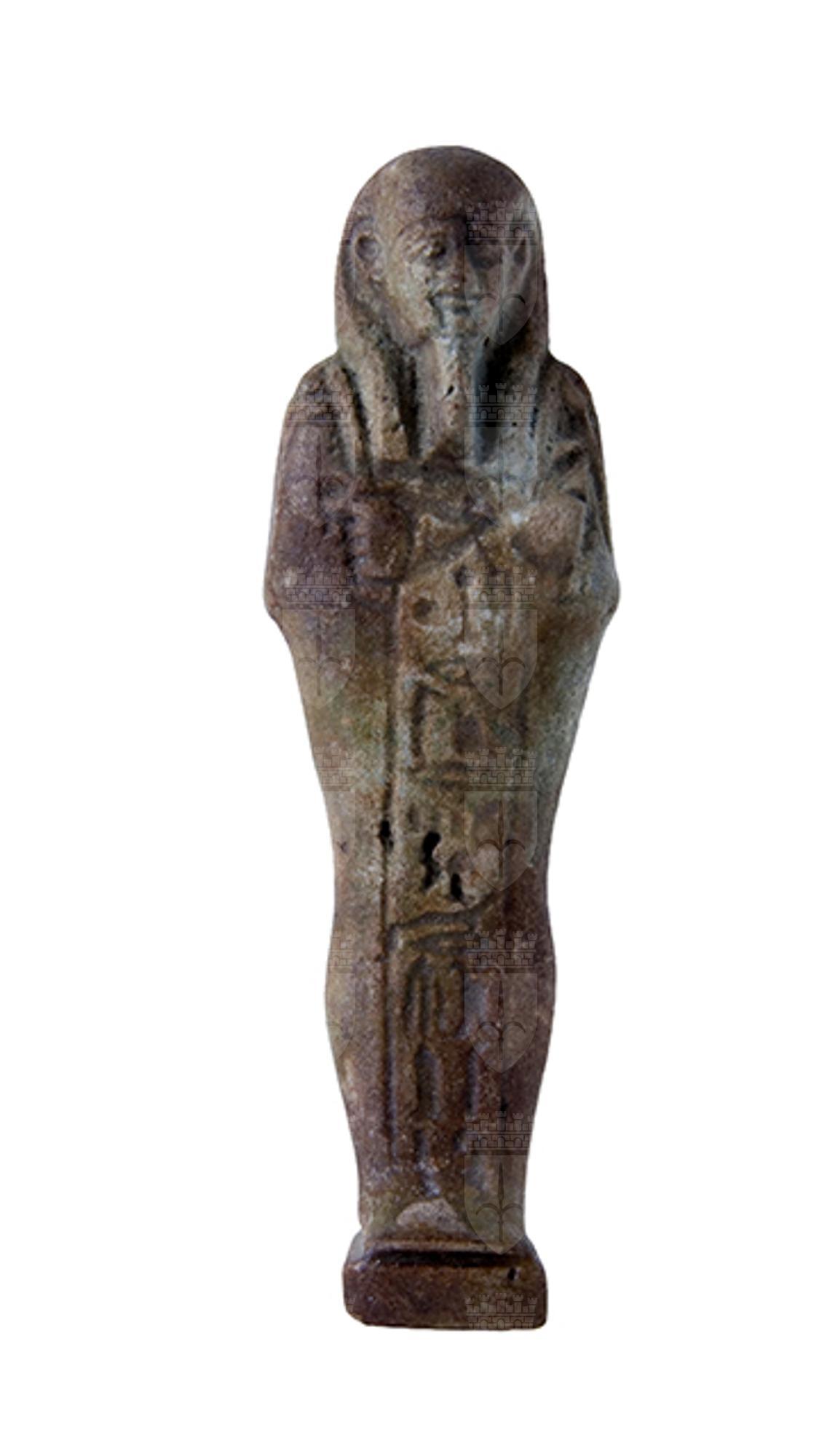 Statuina funeraria mummiforme che indossa una parrucca tripartita e la barba divina. Le mani sono incrociate, la destra sopra la sinistra, e tengono rispettivamente una zappa e un piccone. Dalla spalla sinistra pende una sacca. Il pilastro dorsale e la base sotto i piedi sono presenti. L’iscrizione corre lungo una colonna posta sulle gambe della statuina.