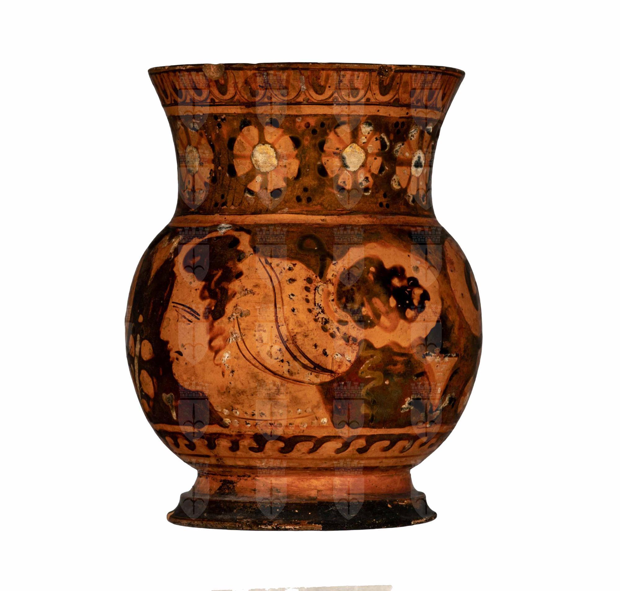 Boccale apulo a figure rosse con piccolo manico anulare verticale. Sul ventre testa femminile, foglie d'edera, fiore campanuliforme; fila di rosette sul collo e motivo ad onde sopra il piede.