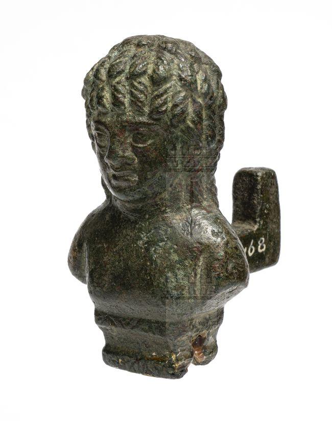 Busto di giovane africano dal torso ignudo, il capo coperto da una folta chioma composta da file di boccoli, incisi da solchi paralleli e divisi tra loro da un solco più profondo. Marcati i lineamenti infantili del volto, incise le pupille. Dalla schiena sporge un perno a L.
