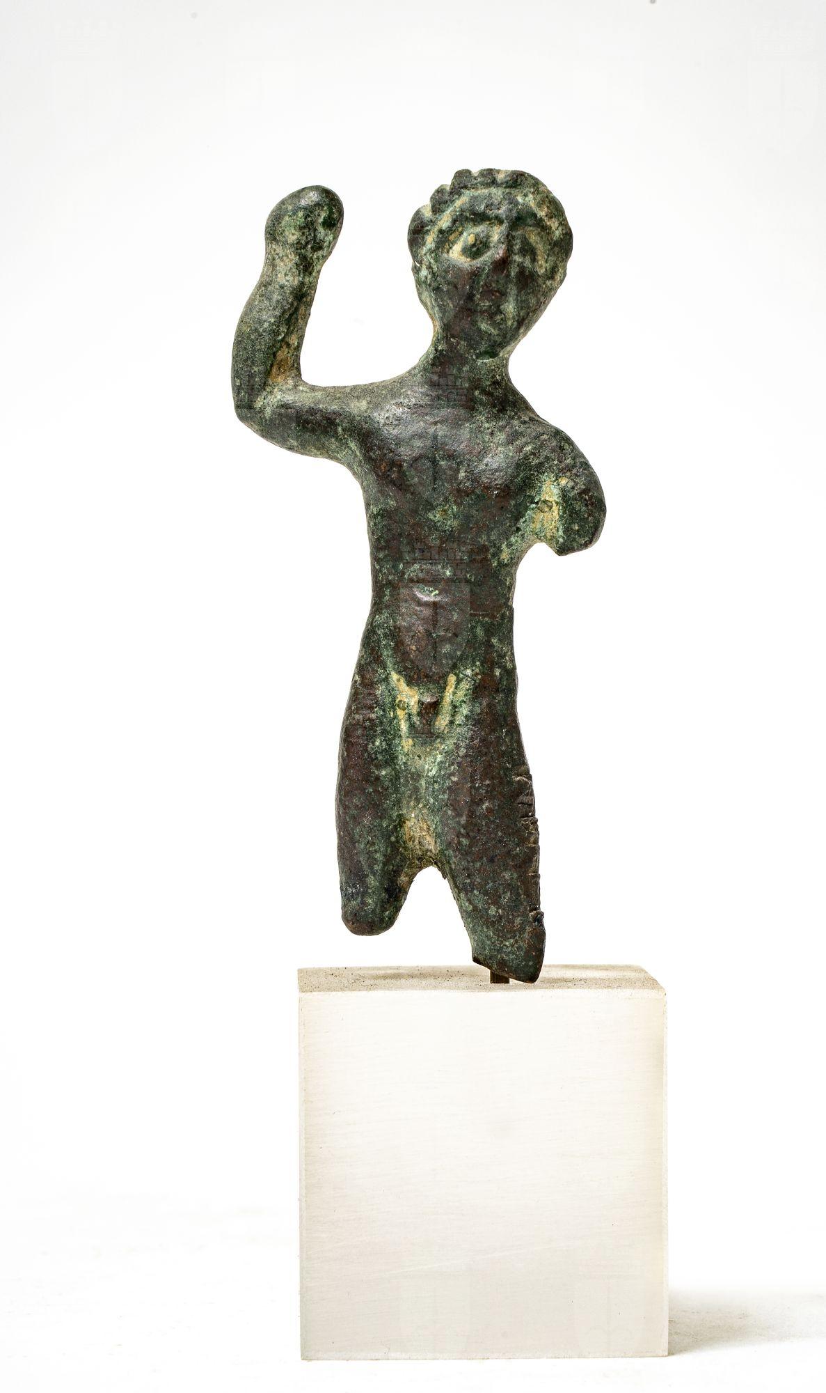 Statuetta d'Ercole con il braccio destro alzato a colpire con la clava, mancante. Patina verde.
