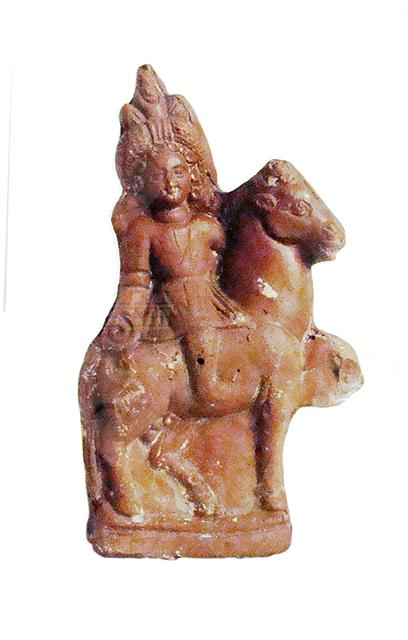 In epoca greco-romana il dio Arpocrate non fu più un bimbetto magro e longilineo in posizione ieratica, ma divenne un putto grassoccio e spesso scomposto, che del suo antenato conservava solo la corona faraonica e il dito alla bocca, anche se non sempre. Il dio fu, soprattutto nel Fayum, una divinità agraria, protettrice dei raccolti. La cornucopia, che spesso tiene in mano, è simbolo di fecondità ed evoca il collegamento con il padre Osiride-Serapide, dio della vegetazione. Inoltre Arpocrate, come sua madre Iside, aveva il potere di allontanare i mali e proteggere dal morso degli animali velenosi. Nelle collezioni museali, le figurine di questo dio occupano comunemente una posizione di preponderanza rimarchevole. Questo fenomeno, che non si accorda con il modesto posto occupato dal giovane dio nell’ambito del culto ufficiale dei templi, mostra con evidenza che la grande produzione rispose alla domanda della clientela popolare, certamente più attaccata al dio bambino che alle maggiori divinità del pantheon tradizionale, e al quale erano dedicati altari domestici e piccole cappelle lungo le vie. Il giovane dio veste una corta tunica dalle ricche pieghe, siede cavalcioni sulla groppa del cavallo e con una torsione di 90 gradi presenta il busto frontalmente. Ha il braccio destro disteso, con il dorso della mano poggiato sulla schiena dell’animale, e tiene una piccola patera rotonda, mentre il braccio sinistro non è visibile, nascosto dietro il collo del quadrupede. Il volto minuto è circondato dai folti riccioli sormontati dalla ghirlanda di rose e nastri e, in alto, dalla corona reale pscent, affiancata da due boccioli di loto. Il cavallo, realizzato di profilo, ha la zampa anteriore sinistra sollevata nell’atto di avanzare al passo con andatura maestosa. La lunga coda, legata da un nastro, scende fino a terra e lo spazio tra le zampe è pieno, reso con un piano ribassato liscio. Modellata in stampo doppio, la figurina ha interno vuoto, base modanata e aperta inferiormente, retro lisciato con il foro circolare per la miglior riuscita della cottura e conserva tracce del rivestimento bianco.