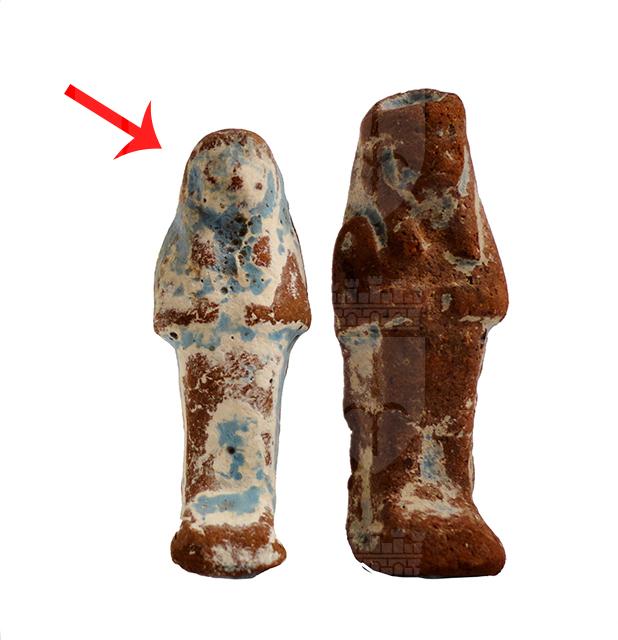 Statuina funeraria mummiforme che indossa una parrucca tripartita. Le mani sono giustapposte, le gambe sono segnate. Il retro è piatto. L’ushabti è privo di iscrizione e serviva verosimilmente come amuleto.